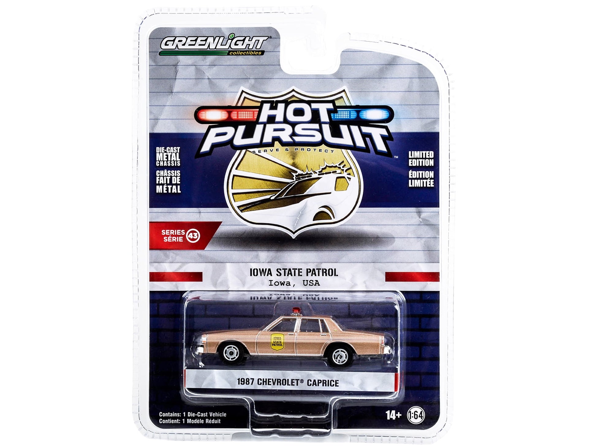 Brand new 1/64 scale diecast car model of 1987 Chevrolet Caprice Beige Metallic "Iowa State Patrol" "Hot Pursuit" Series 43 die cast model car by Greenlight. Limited edition. Brand new box. Chrome accents. Real rubber tires. True-to-scale detail. Detailed interior, exterior. Comes in a blister pack. Officially licensed product. Authentic department livery. Die-cast metal body and chassis. Individualized Hot Pursuit packaging. Manufacturer's original unopened packaging. Dimensions approximately L-3.25 inches long.