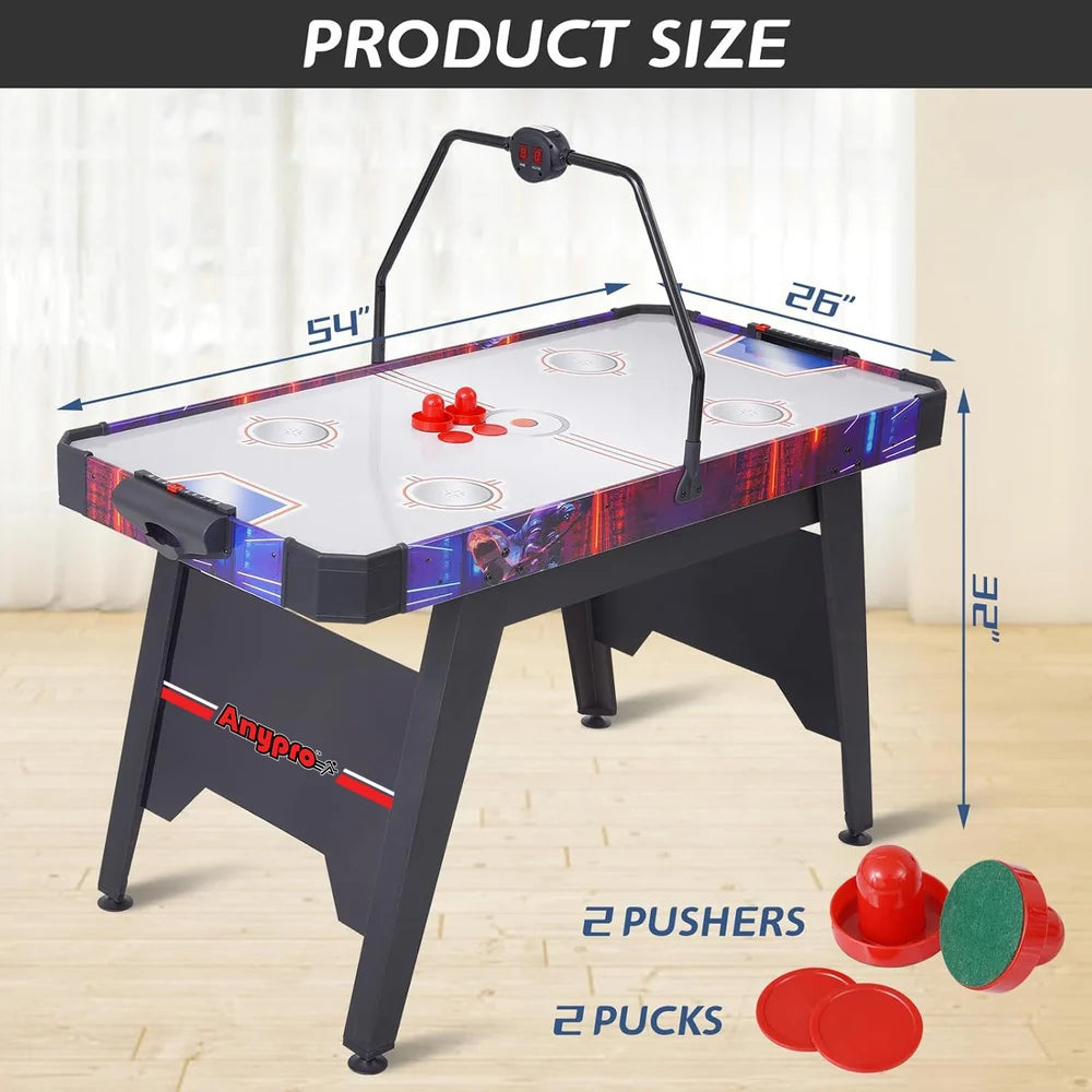 - 【ALL ACCESSORIES INCLUDED & EASY ASSEMBLY】With detailed assembly instructions and all hardware delivered, it's easy to set up your air hockey tables & equipment with finished dimensions of 54” x 26” x 32”(L x W x H). The premium air hockey set includes an AC adapter, an electronic scoreboard (AAA batteries not included), 2 pushers, and 2 pucks.