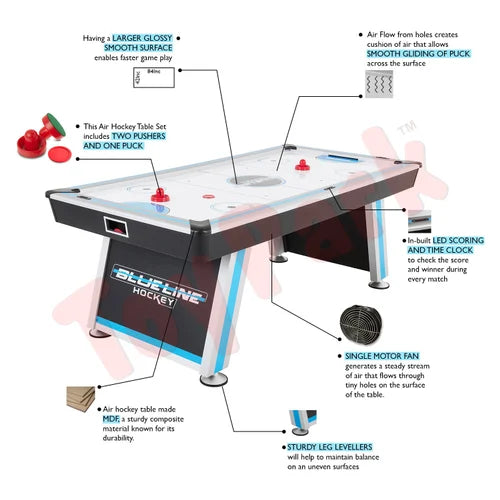 - Premium motor and high gloss play field produce fast puck action and family fun