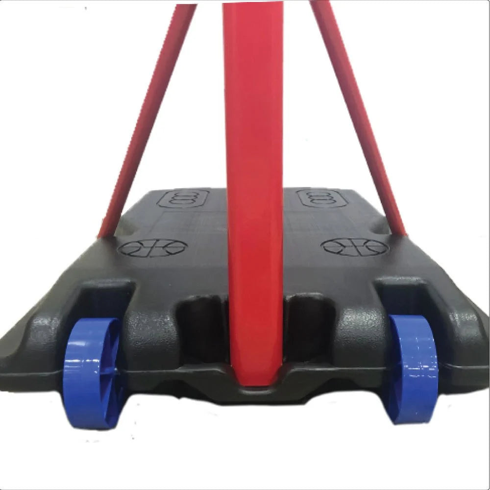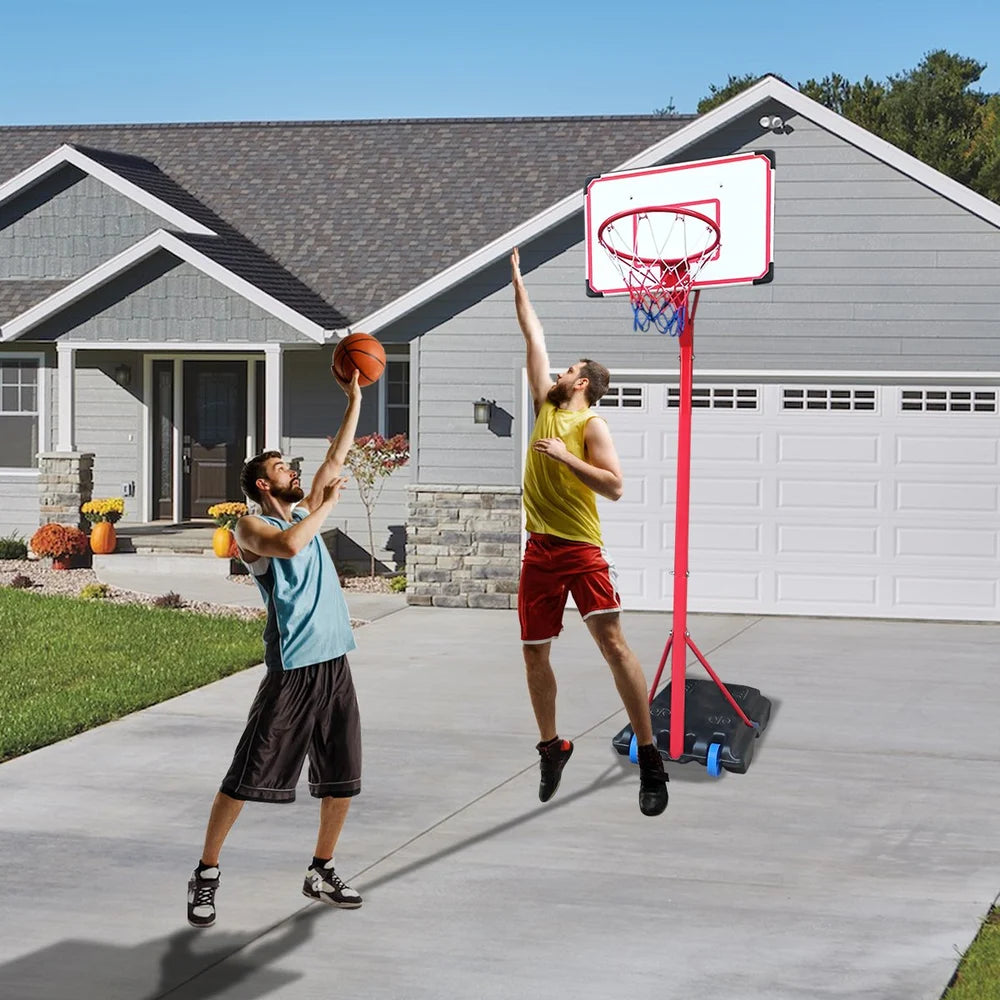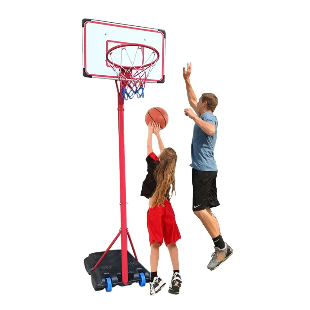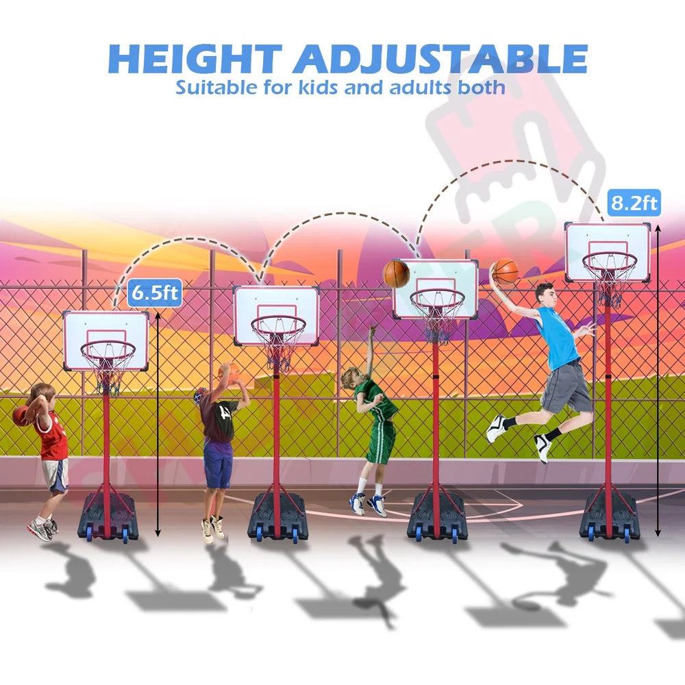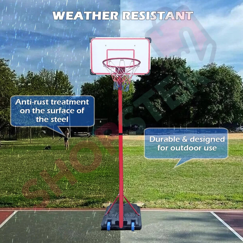 8.5 feet adjustable Metal Basketball Set with stand.Robust rotomolded plastic backboard with height adjustable (6.5ft. to 8.2ft.) and portable wheels on the base.Durable and designed for outdoor use.