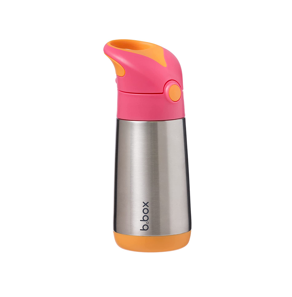 We've redefined cool with our new insulated drink bottle. Our newest drink bottle has insulating super powers The double walled stainless steel keeps liquids cool for up to 8 hours and warm for up to 6, so now your little one can stay hydrated whatever the weather. Complete with carry handle and push button opening, designed specifically for little hands. Clean modern design and big kid aesthetic. Available in six fab b.box colours. Kids love our easy drinking silicone straw top. Parents love no leaks in the bag (when the lid is closed). Replacement straw packs available, sold separately. When using to keep liquids warm - for best performance fill the stainless steel base with hot water for a few minutes to warm it before pouring water out - and filling with warm liquids.