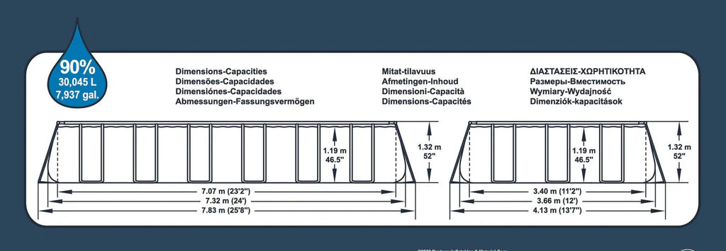 Size: 7.32 m x 3.66 m x 1.32 m (24 ft. x 12 ft. x 52 in.)