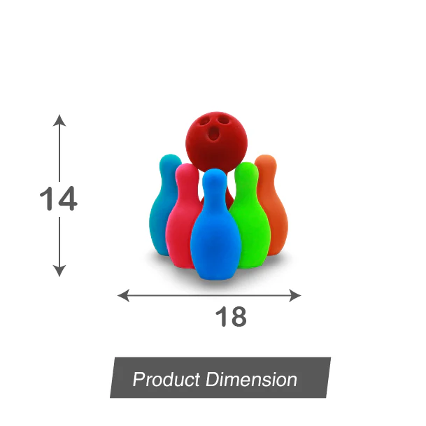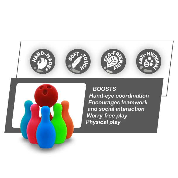 A colorful six pin bowling set made from foamed natural rubber. It's squishy and safe for babies and toddlers. The tactile texture makes it fun to hold and engages kids in active play.