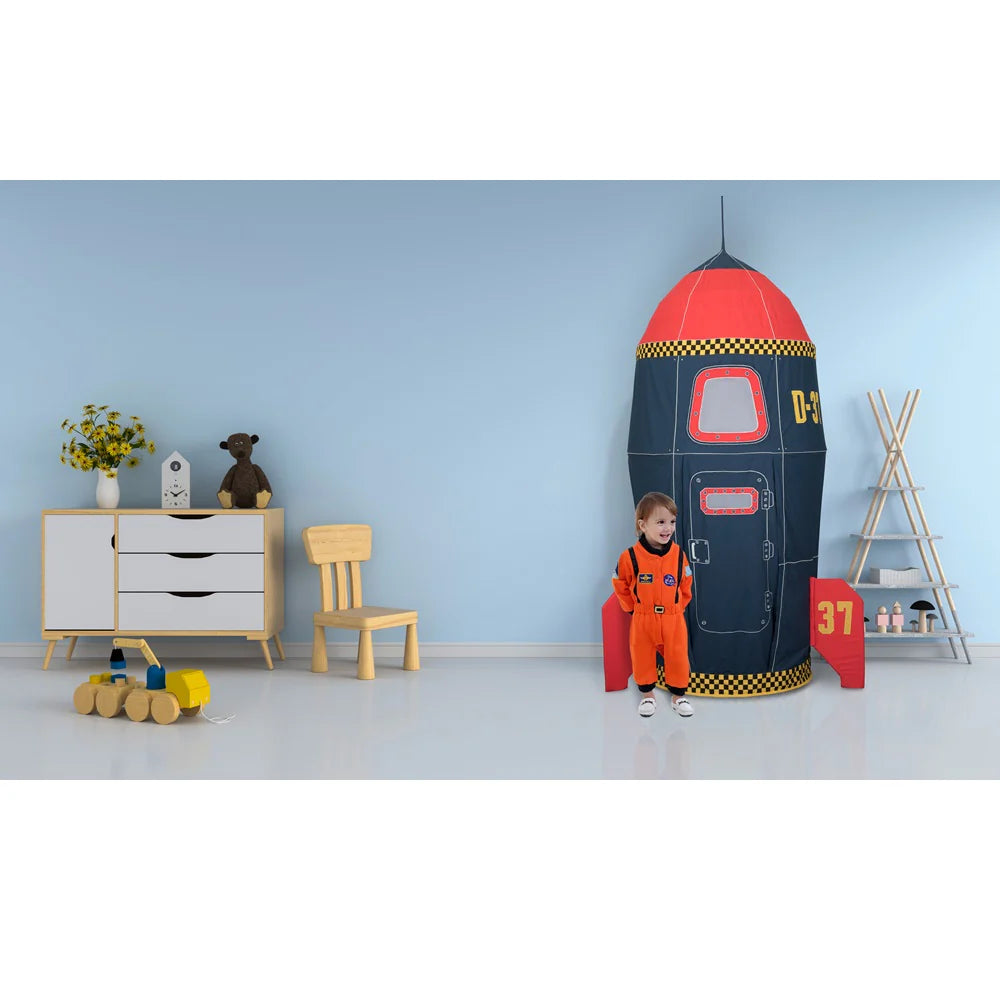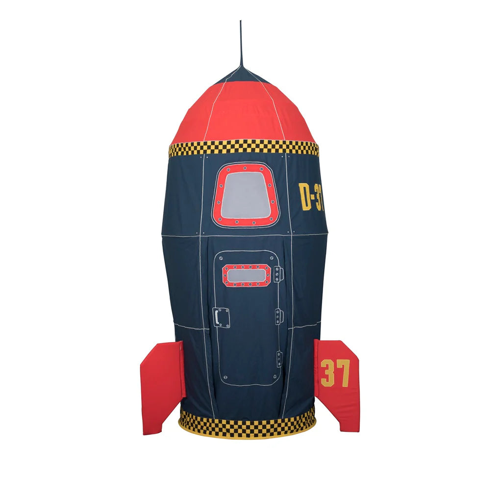 Rocket Ship Features an illustrated fabric print of rocket with port windows, detachable fins, airlock door, and flexible hoops. just hang from the ceiling and watch the room transform. Made from 100% pure Cotton Percale. Great for pretend play or a little reading nook.