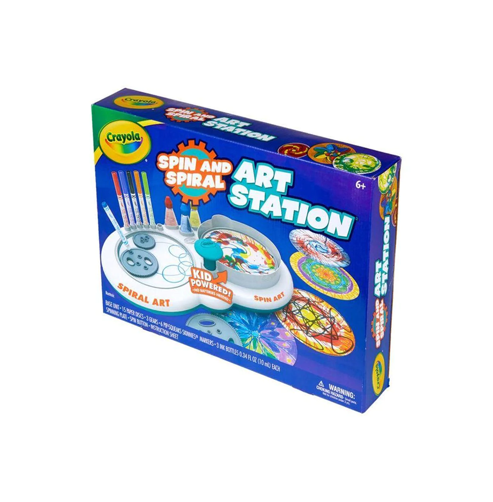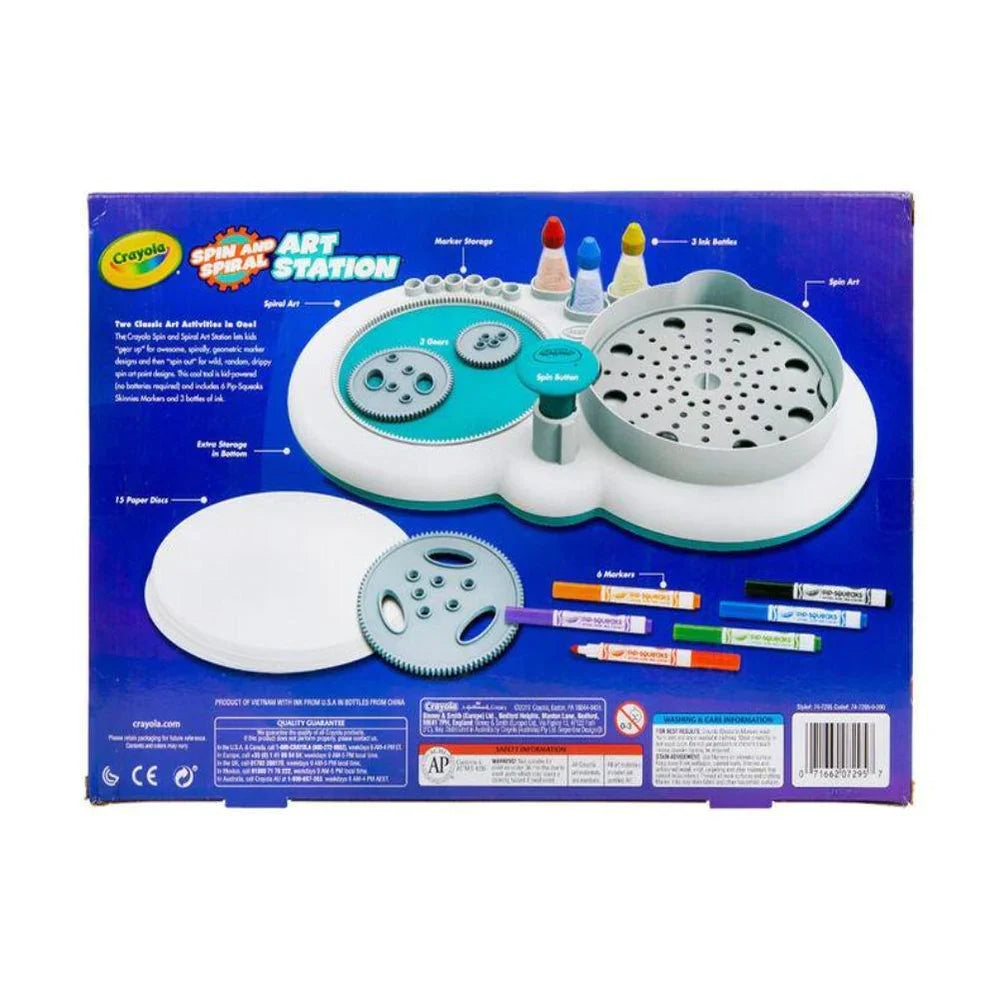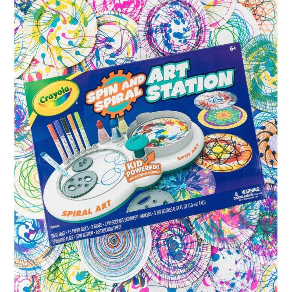 Two classic art activities in one! The Crayola Spin 'N Spiral Art Station lets kid "gear up" for awesome spirally geometric marker designs or "spin out" for wild, random drippy spin art paint designs. Create combo designs using both activities to elevate your art! This cool tool is kid-powered—no batteries required—and includes 6 Pip-Squeaks Skinnies Markers, 3 Bottles of Paint, and 15 Paper Discs. Plus, you can keep the fun going with our Paper Disc Refill Set (sold separately)!
