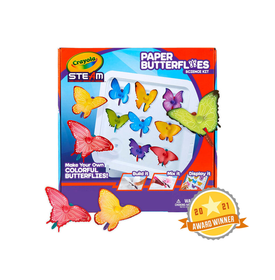 The Crayola Paper Butterfly Science Kit let’s kids create beautiful paper butterflies that explode with color! This unique craft lets kids learn about the physics of capillary action as colorful inks are absorbed into the wings of paper butterflies! This STEAM-powered kit provides a hands-on learning experience that allows kids to be creative and have fun while they learn! The magic of these colorful butterflies is where science and art comes together! This kit features everything needed to make 12 Wicking Paper Butterflies, as well as a guide with step-by-step instructions. Makes a great gift for girls and boys on birthdays, holidays, and more. Safe and nontoxic, the kit is ideal for kids, ages 7 & up.
