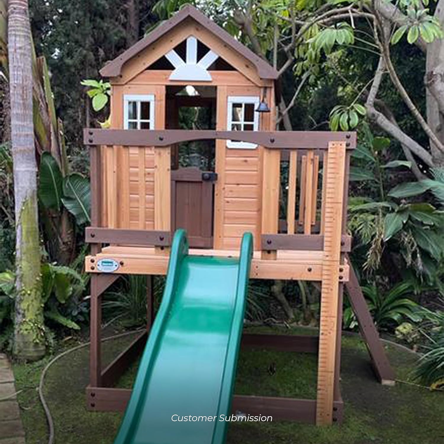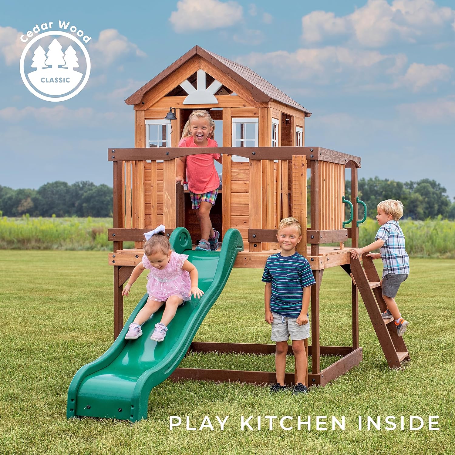 - Raised PLAYHOUSE: This 3-foot-tall raised playhouse features a little design. a wraparound deck with bigger windows that allow you to watch what your kids are doing. includes a wave slide that is six feet long and a flat step ladder.
