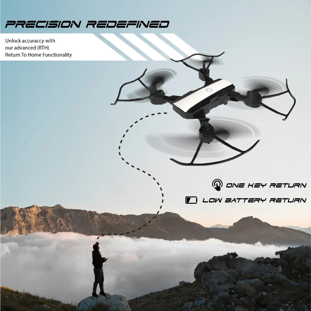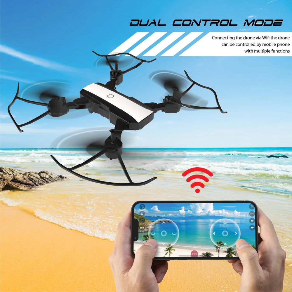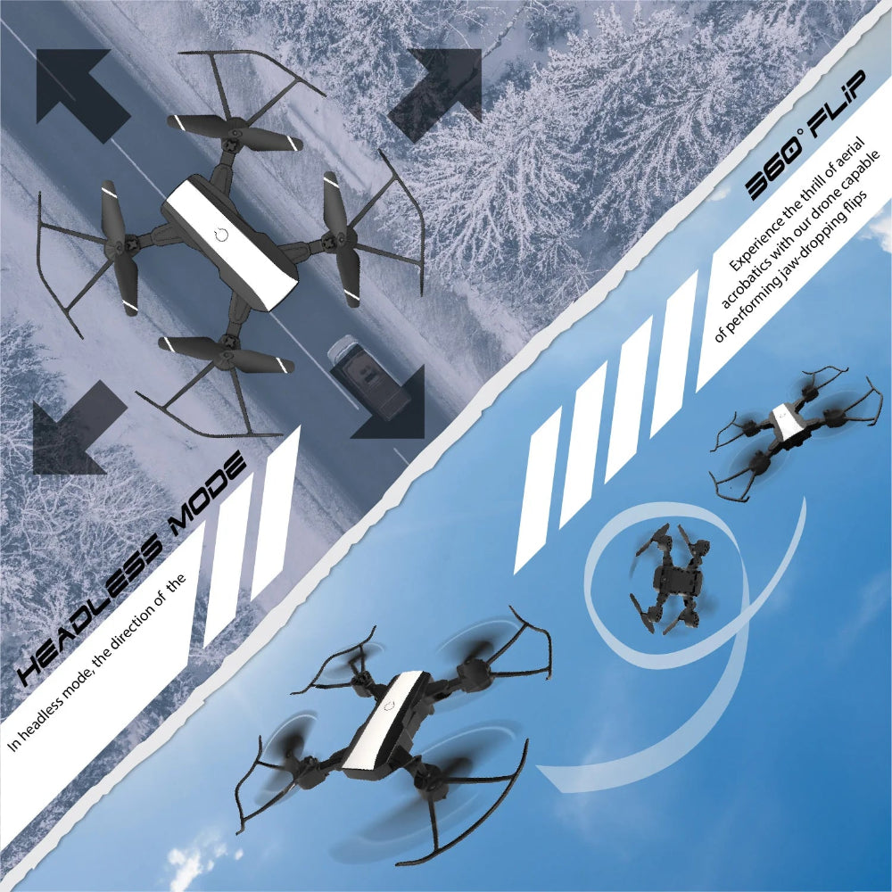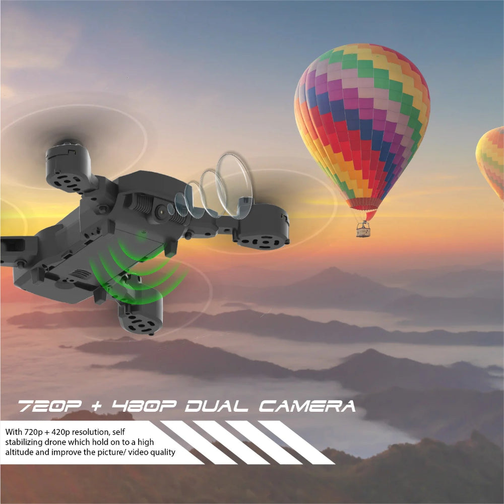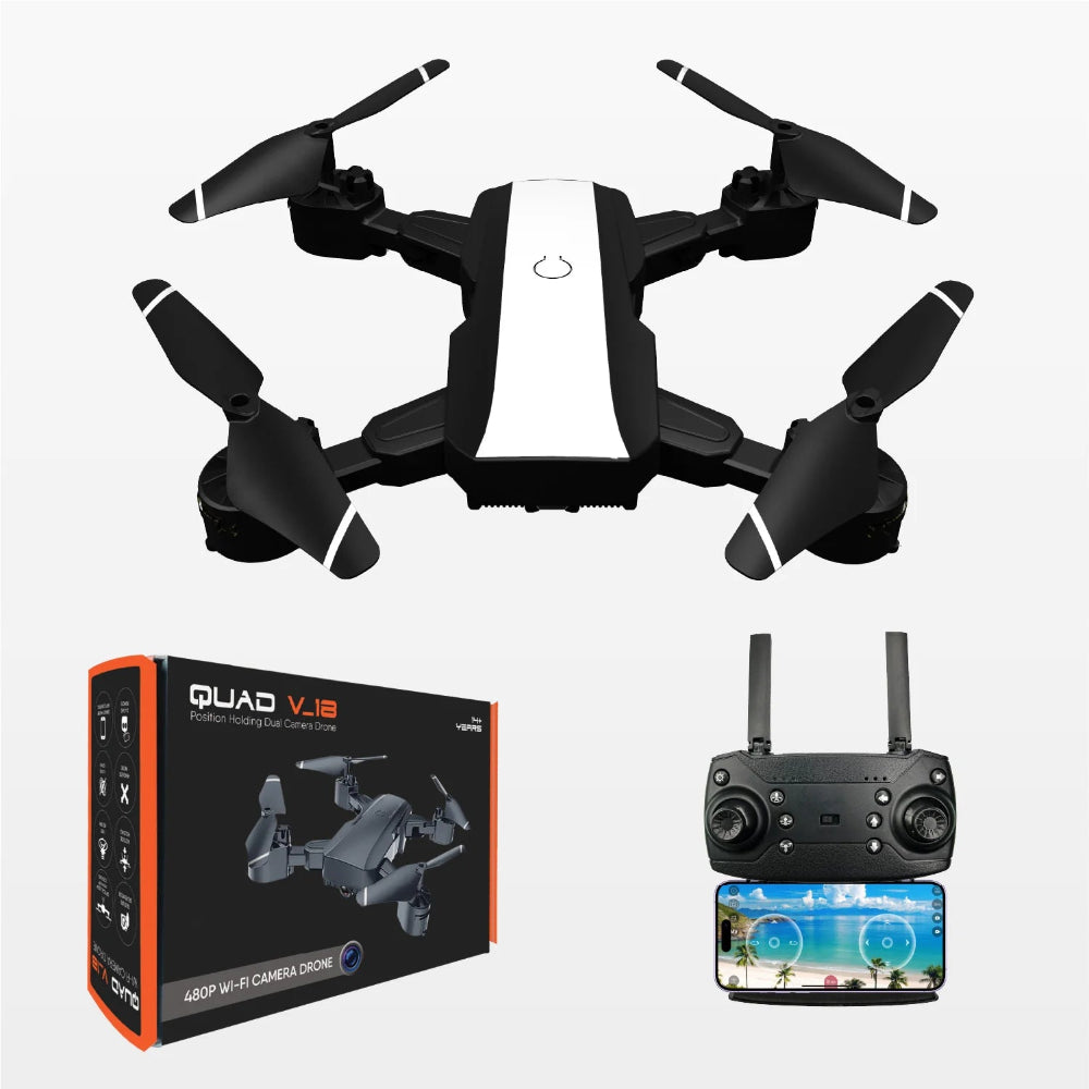 The Dual-camera Drone QUAD V 18 is a compact, lightweight drone perfect for indoor and outdoor flying. It features a dual-camera system capable of recording HD 720P video and capturing photos. The drone also offers a headless mode, eliminating concerns about orientation for easy control responsiveness.