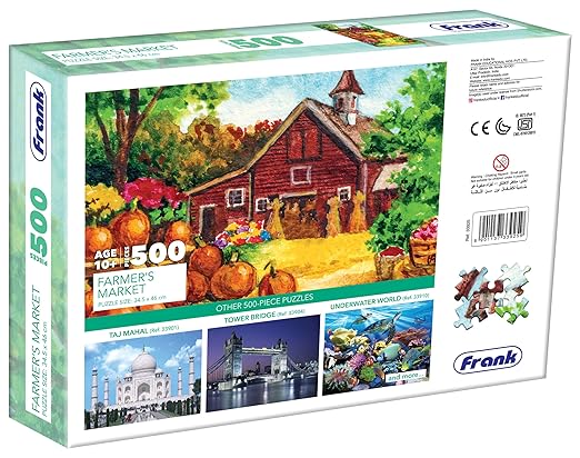 - About the Product: Experience the lively charm of a Farmer's Market with the Frank Farmer's Market Jigsaw Puzzle. Featuring 500 beautifully crafted pieces, this Jigsaw Puzzle for Adults offers a fun and stimulating puzzle game experience for both adults and kids aged 10 and above. Perfect for market lovers and puzzle enthusiasts!