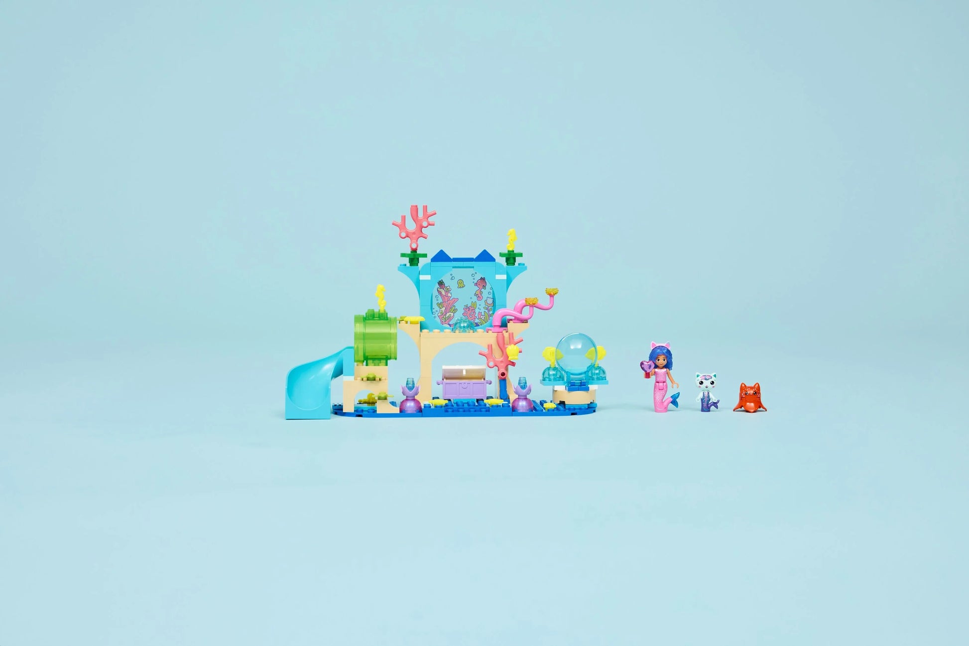 - The colourful set has shells, plants, sea life, a fun slide and a giant bubble