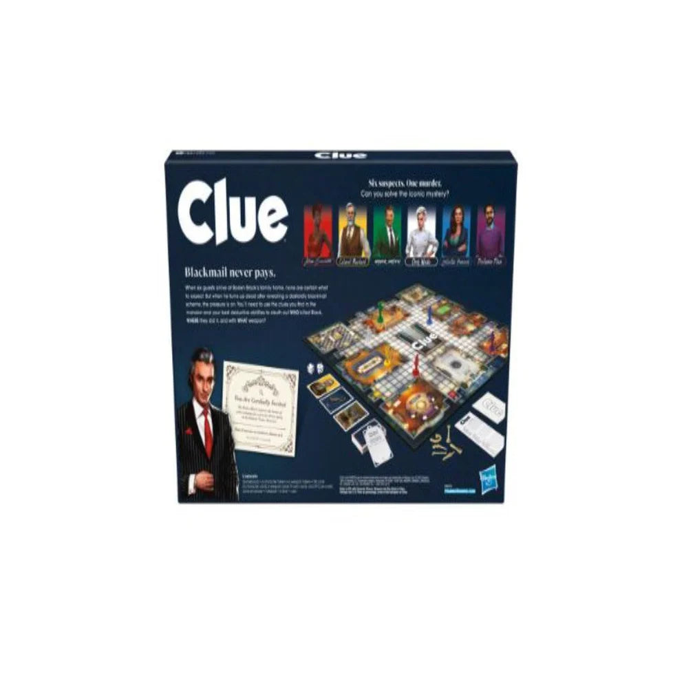 Who killed Boddy Black? Solve the mystery in this suspenseful Clue board game! When 6 guests arrive at Boden Black’s mansion, none are certain what to expect. But when their host turns up dead after revealing a sinister blackmail scheme, the pressure is on. Race against the other players to crack the case by gathering clues and narrowing down choices. Each player tracks their clues in a detective notepad and eliminates information to sleuth out who killed Mr. Black, where in the mansion they did it, and what weapon was used. Roll a magnifying glass icon? Draw a Clue card to add to the intrigue! A player might open a new secret passage or get to name a weapon they want revealed. Be the first to make the correct accusation and win the game! This Clue murder mystery game is beautifully reimagined with a dazzling cast of characters, luxurious setting, and fresh storyline. It's a fun game for families, friends, mystery fans, and kids ages 8 and up!