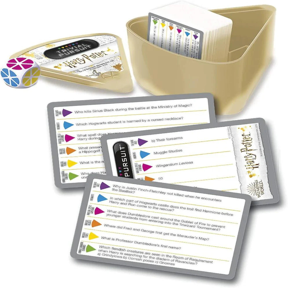 Harry Potter fans can test their knowledge of the beloved wizard with the Trivial Pursuit: Wizarding World Harry Potter Edition! It's a compact and quick-playing edition of the Trivial Pursuit game that includes 600 trivia questions about the magical world and favorite characters of the Harry Potter movies. Some questions might challenge even the wisest of wizards! What is the Trace? What is Krum's first name? How many brothers does Ron have? Face the challenge with these and other trivia questions in 6 categories. Roll the die and choose a category color. Keep answering questions correctly to collect Trivial Pursuit cards and win the game. This engaging indoor game for families requires no gameboard, and comes in a handy, wedge-shaped container, making it easy to store the game pieces and taking this kids game on the go. It’s one of the most entertaining travel games for plane rides, road trips, and more! Family board games and trivia card games like this Harry Potter board game make great family gifts for 8 year old girls and boys and up. Add this trivia game to your Harry Potter toys collection! WIZARDING WORLD characters, names and related indicia are © & ™ Warner Bros.