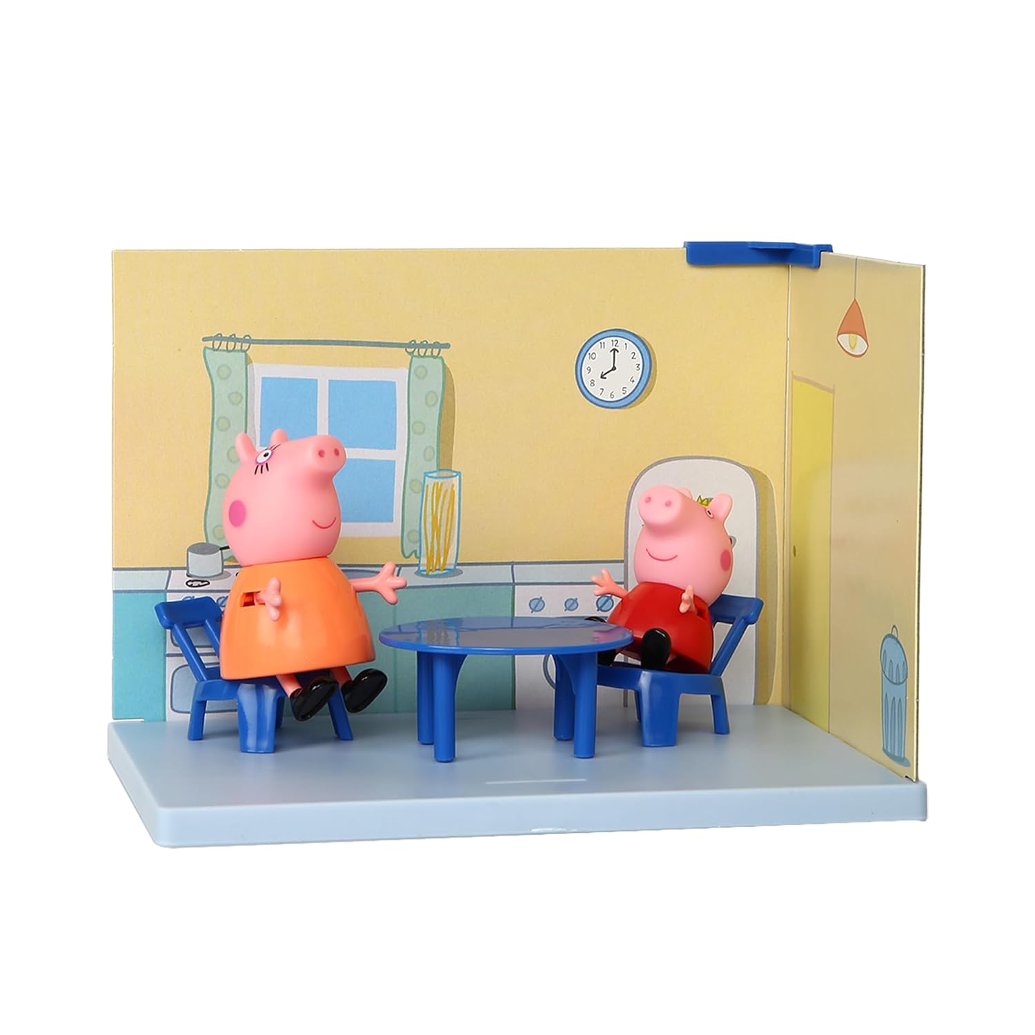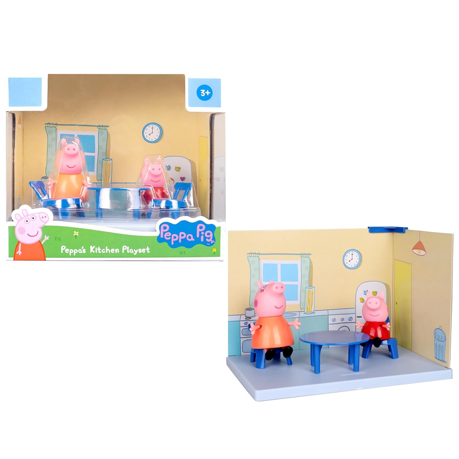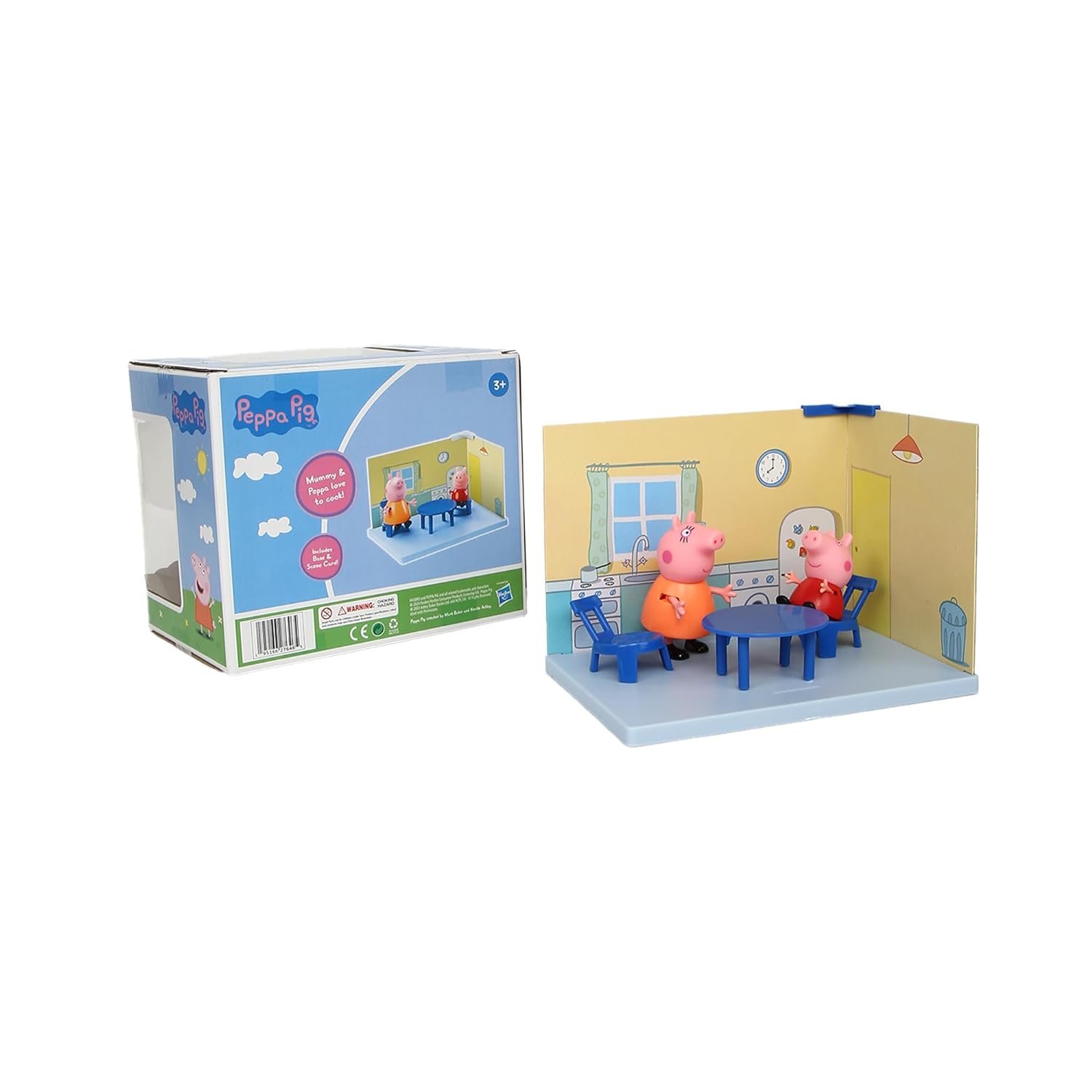 - PEPPA PIG LOVES TO COOK: Peppa Pig Kitchen Playset Toy includes Peppa Pig and Mummy Pig with accessories and a kitchen scene card. Kids can imagine Peppa helping Mummy in the kitchen