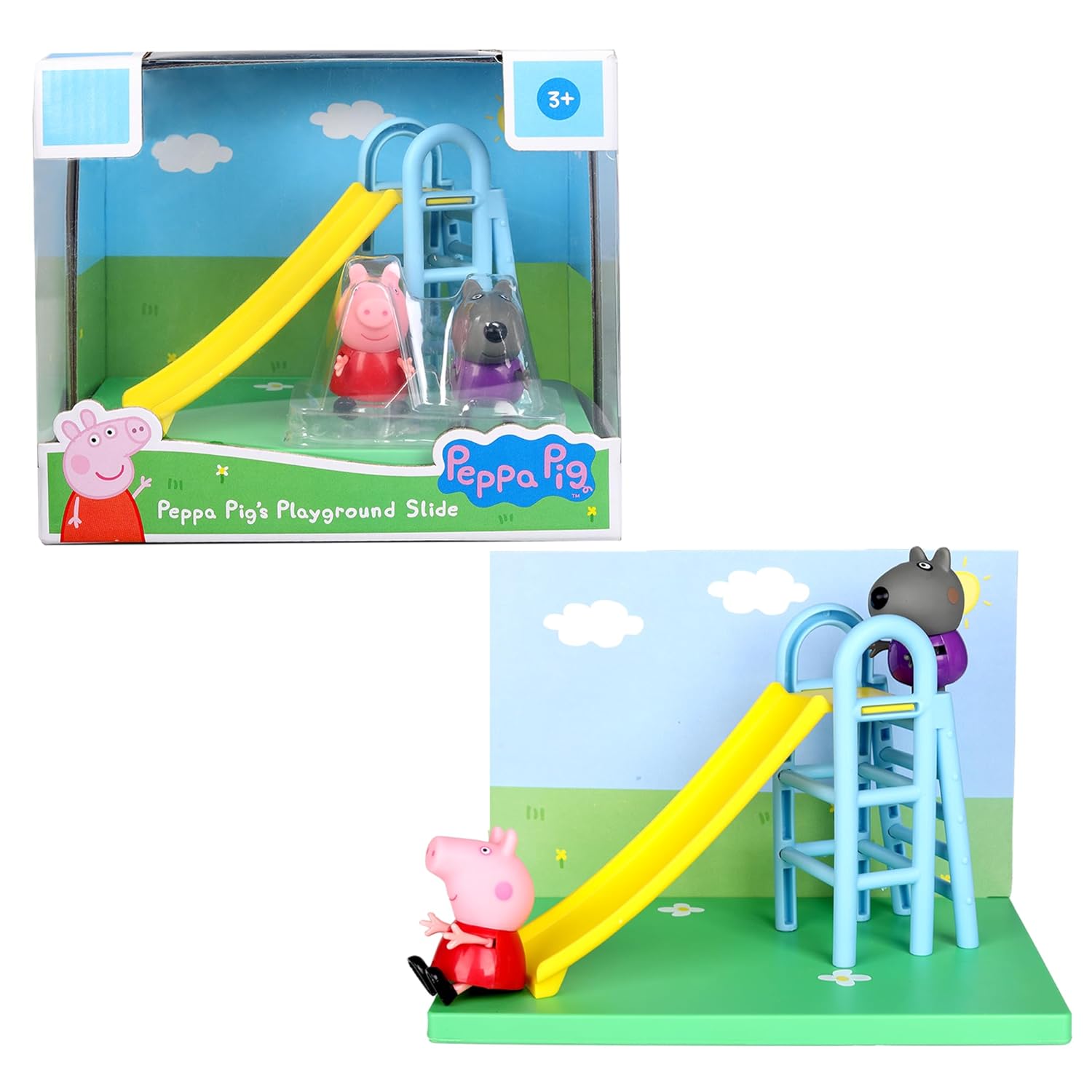 The oinktastic Peppa Pig's Playground Slide themed playset with Peppa Pig and Danny Dog figures, includes 2 figures and playground slide accessory created on a 3-inch scale! Includes poseable Peppa Pig and Danny Dog figures, playground slide and background scene card inspired by the show as seen on TV. Kids ages 3 and up will love imagining great outdoor fun with their little hands!