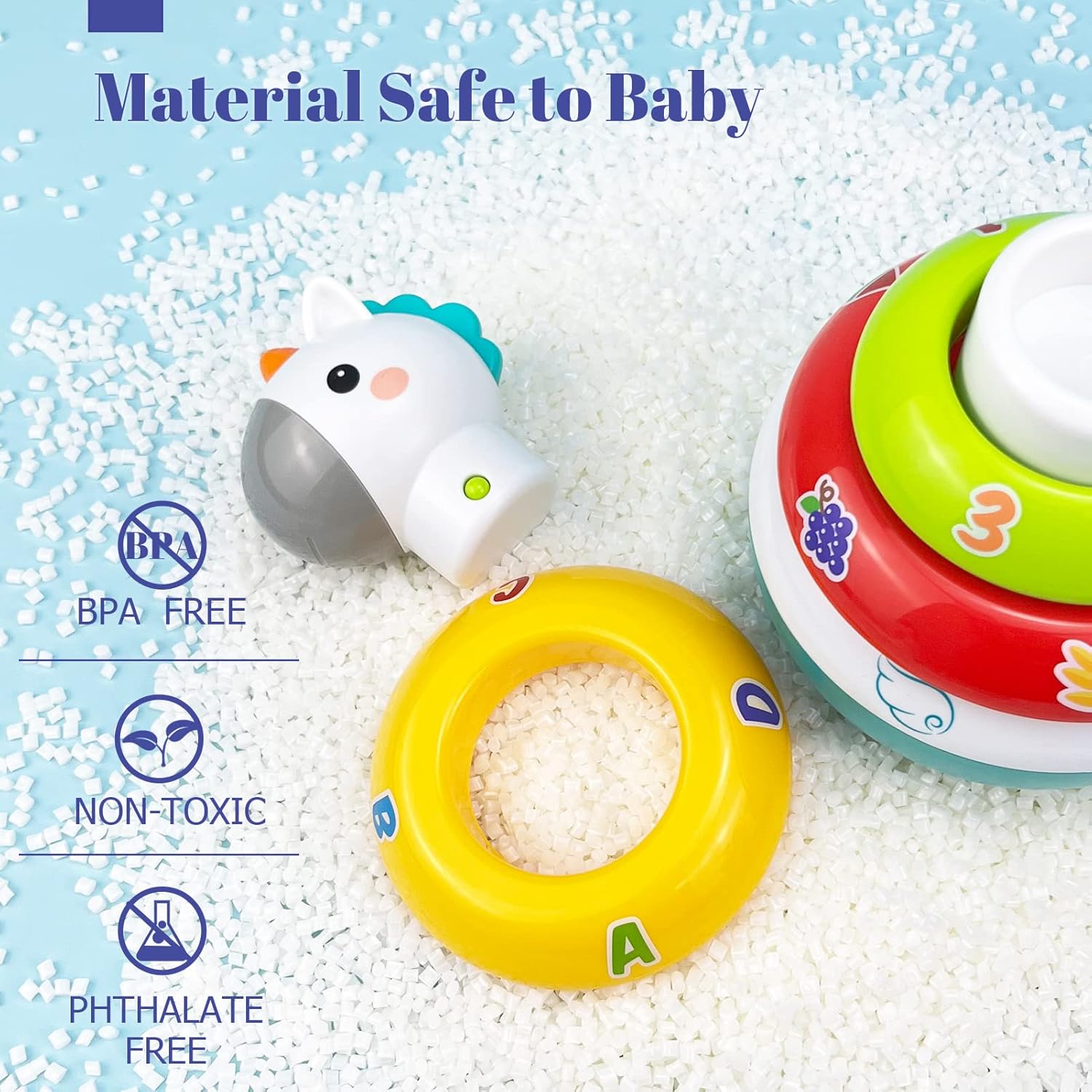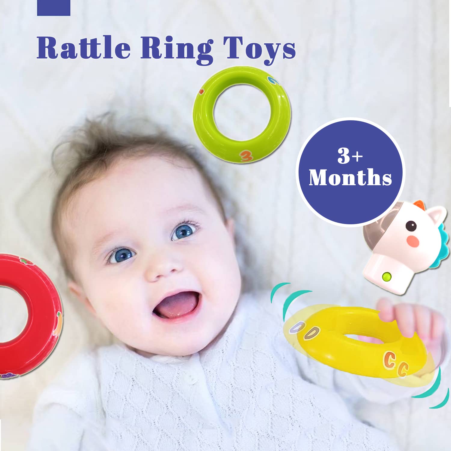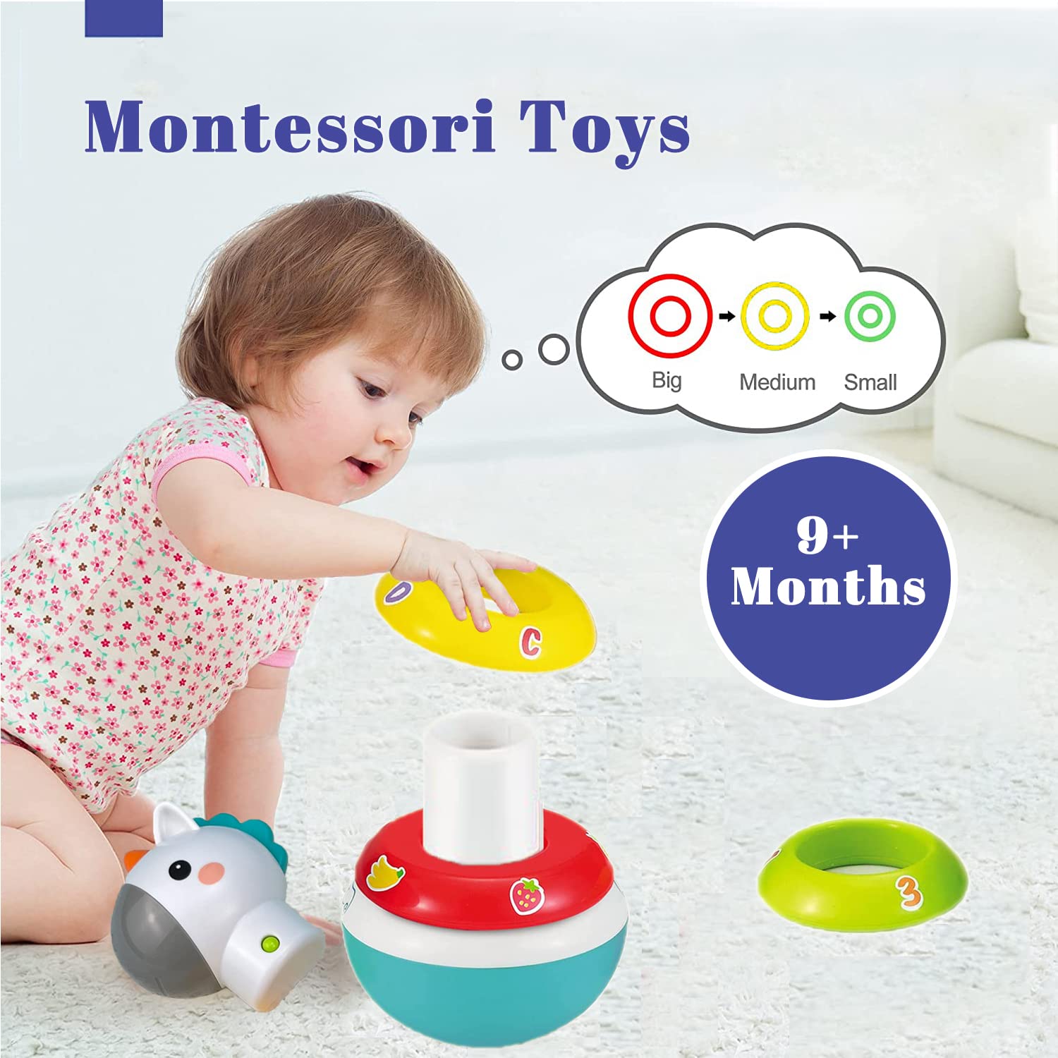 - Spinning Stacking Toy: Montessori toys for babies 3-6 months, equip with three colorful rattle rings and a unicorn head that can be taken off. Baby can stack it in any order, which can promote the baby’s finger flexibility, hand-eye coordination.