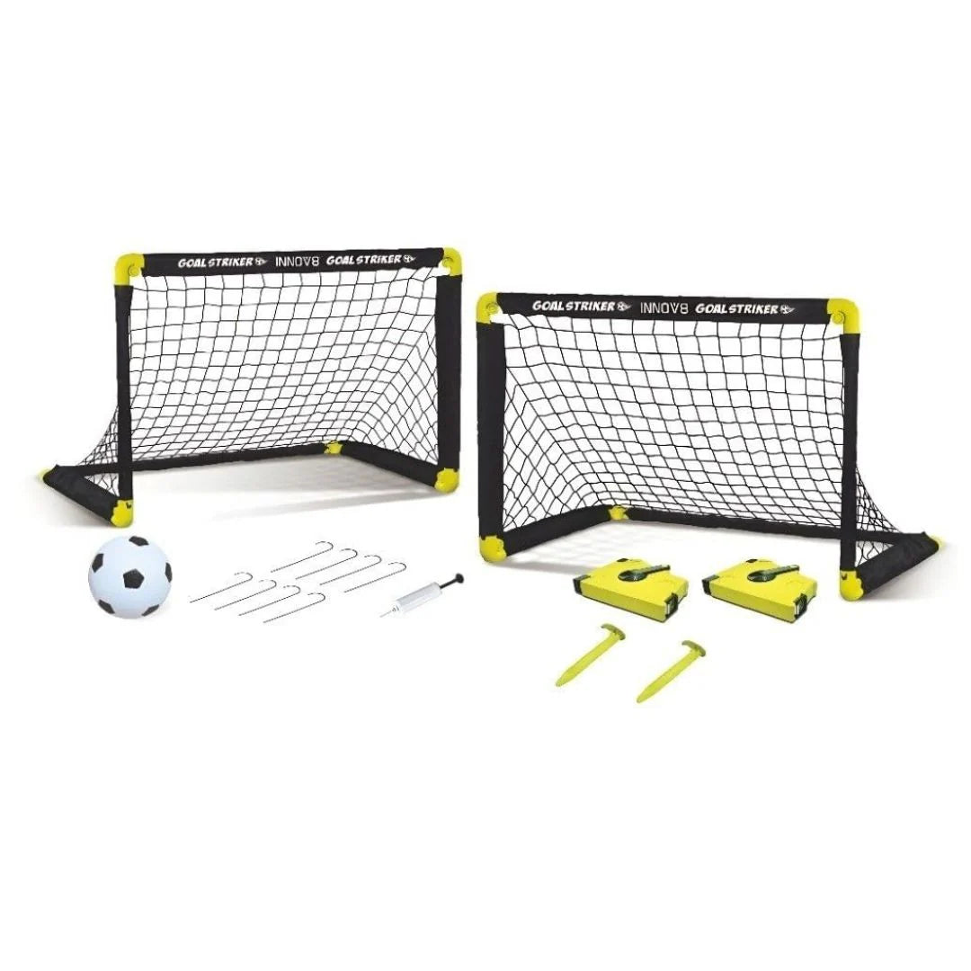 - All-in-one soccer set with essential components like two folding soccer goals, retractable pitch markers (10m x 5m), a soccer ball, ground stakes, and grass holders