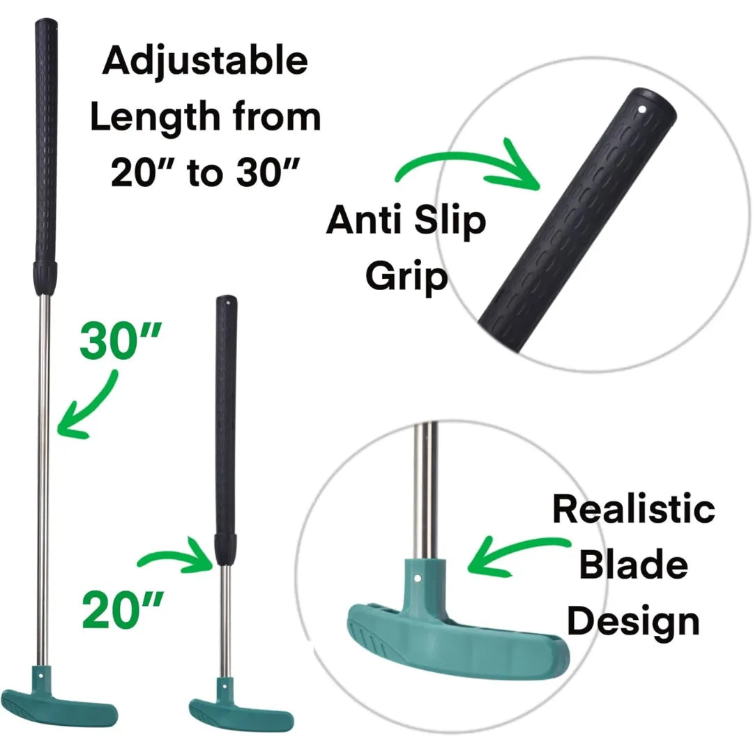 Constructed from durable plastic and designed in a vibrant green color to resemble a real golf course, the Innov8 Sports Putting Game encourages kids to develop hand-eye coordination, precision, patience, and sportsmanship. The ramp-style scoring zone features an electronic light-up hole, which activates when a ball is correctly putted, providing instant visual feedback. The mat can be easily rolled out and laid flat on any smooth indoor surface. The adjustable putter ensures it grows with your child, making it suitable for multiple age groups. Whether used in bedrooms, classrooms, or play areas, this small-size golf set delivers both fun and learning in equal measure.