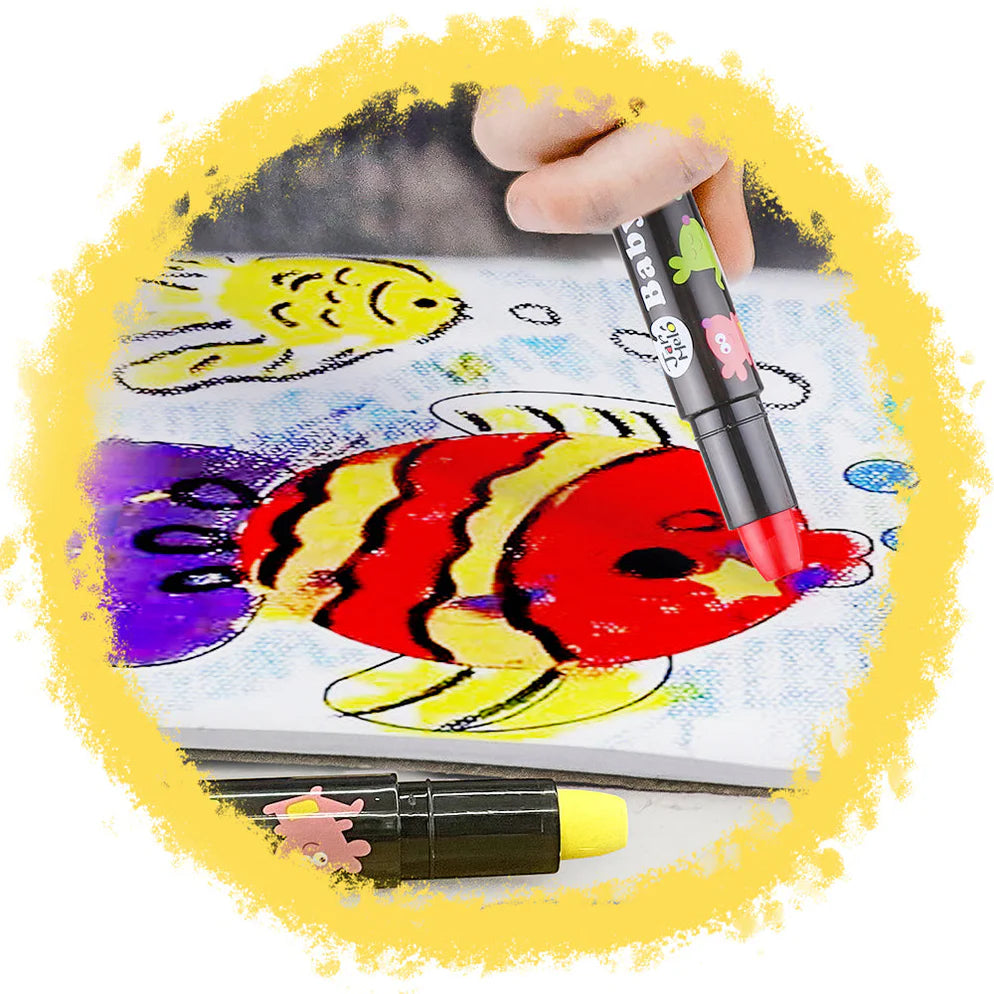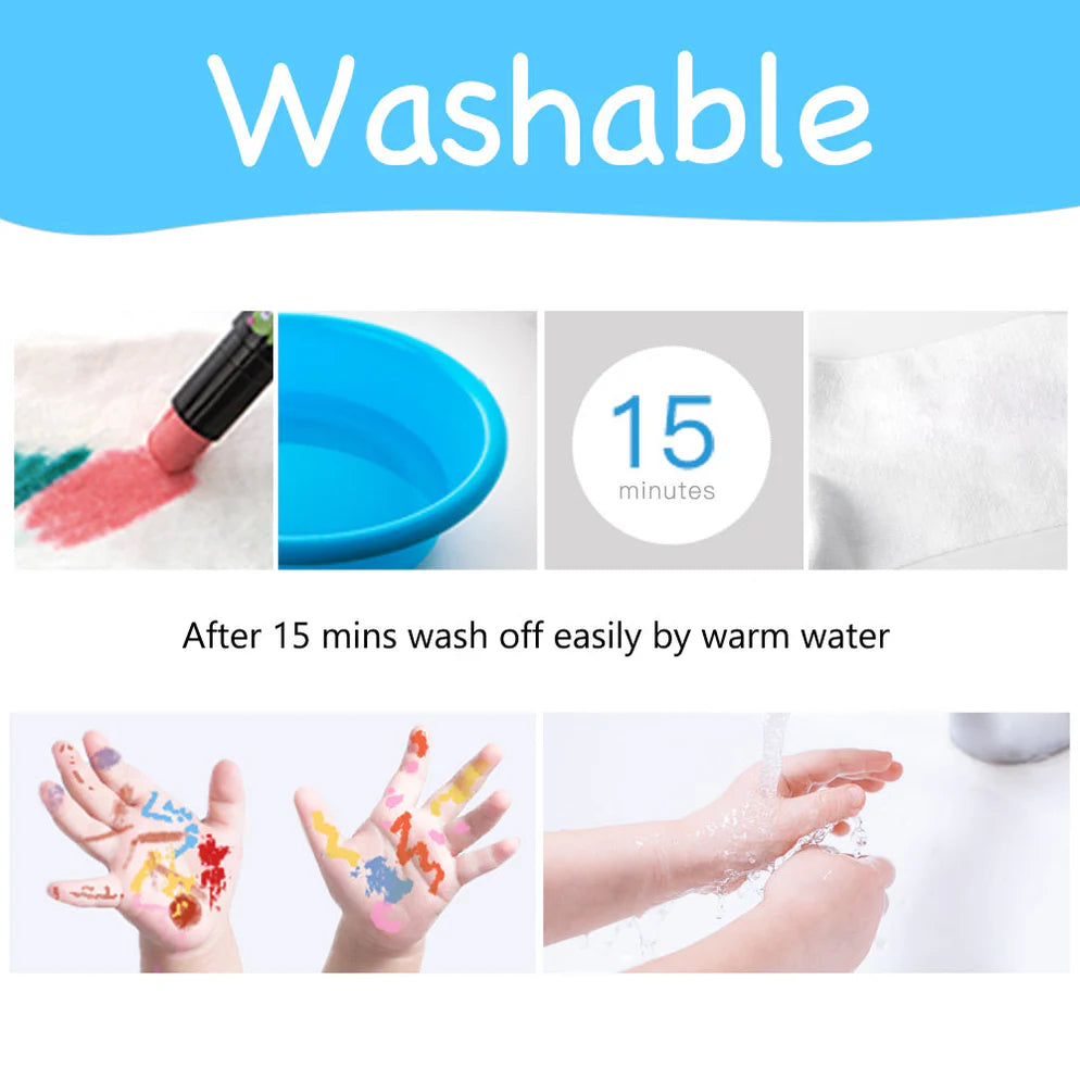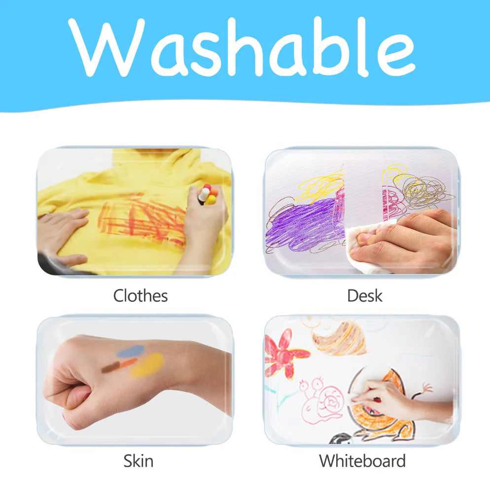 - Dirty marks on clothes & all over the place are always big problems for parents, it’s time to say goodbye !Don’t worry about marks anywhere,washable gel crayons , excellent washable, with warm water or use a damp cloth, will clean them easily. You could clean the bath easily after a coloring game!