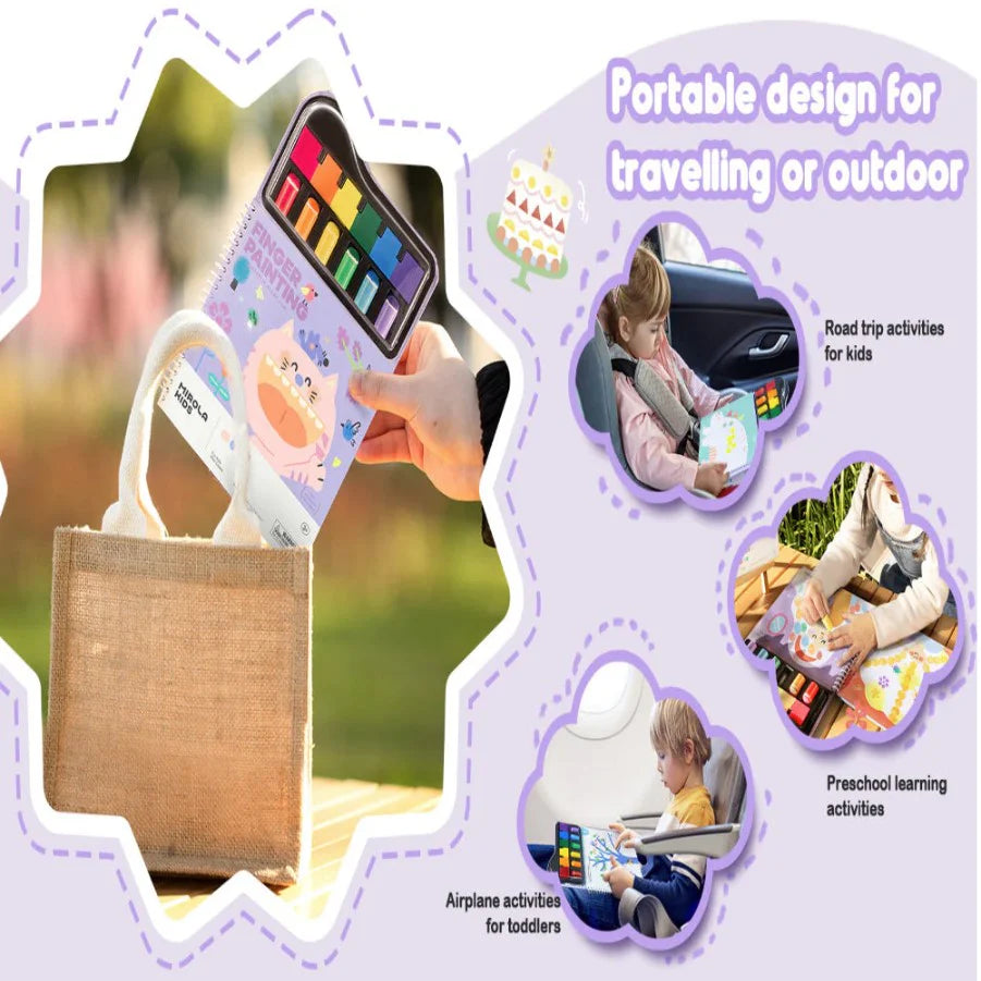 - Vibrant Paint & Stamps :This finger painting kit comes with 1 book of 50 pages, 6 colors paint, 6 colors finger cot, 1 template with 29 patterns. It works by pressing the stamp or your finger onto the sponge to create different patterns on the coloring pad. You could select the finger cot to press correspond color paint,mess free and no color crossing.