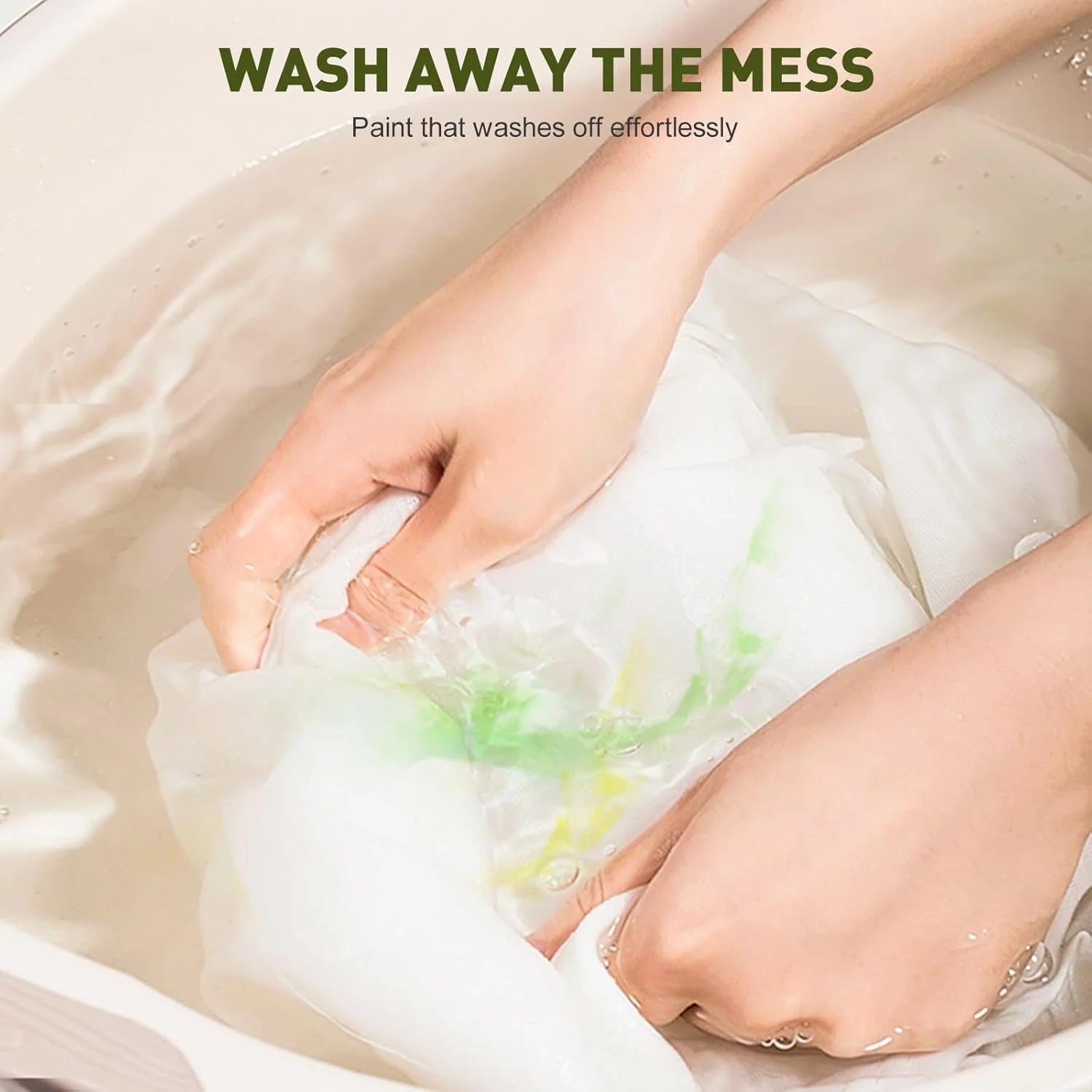 - Easy Cleanup: Our water-soluble paint ensures easy cleanup from skin and most surfaces. Enjoy mess-free fun without worry. Note: Porous fabrics and wood may absorb the paint, making cleaning more difficult.