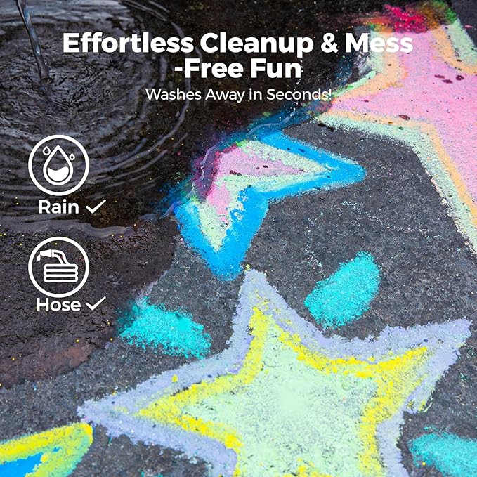 36 Vibrant Colors for Big, Bold Creations – This jumbo sidewalk chalk set comes with 36 bright and colorful sticks, perfect for drawing on sidewalks, driveways, playgrounds, and blacktops. More colors mean more fun and creativity!No More Messy Hands – Includes Chalk with Holders! – Our set includes ergonomic chalk with holders to make drawing easier, keep hands clean, and prevent chalk from breaking. Perfect for little artists who love to create!Easy to Carry & Store – Comes in a durable, portable storage case with a built-in handle, so kids can easily carry their outdoor chalk anywhere—great for playdates, school, and on-the-go fun.Washable & Kid-Safe – Made from non-toxic, dust-free materials, this washable sidewalk chalk is completely safe for kids and meets ASTM D-4236 safety standards. A quick rinse with water or rain easily removes chalk marks!Perfect for Outdoor Fun & Learning – Whether for hopscotch, sidewalk games, school projects, or just creative doodling, this kids’ chalk set is a must-have for birthdays, playdates, and summer fun. Great for toddlers, kids, and even adults!
