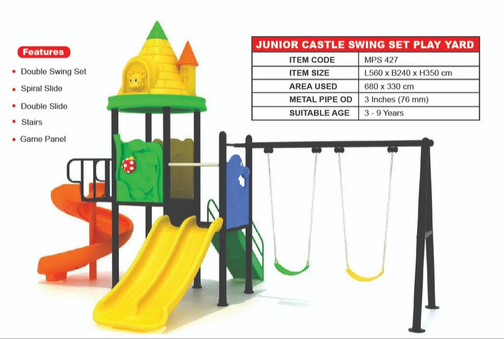 Junior Castle Outdoor Swing Set Play Yard with Twin Swings,Double Slide and a Spiral Slide.Toy Park Multi Play sytems are designed to give a physical and mental stimulating experience to children. The physicality of the tasks on our equipments gives children a sense of achievement, which helps in shaping a mindset for success.