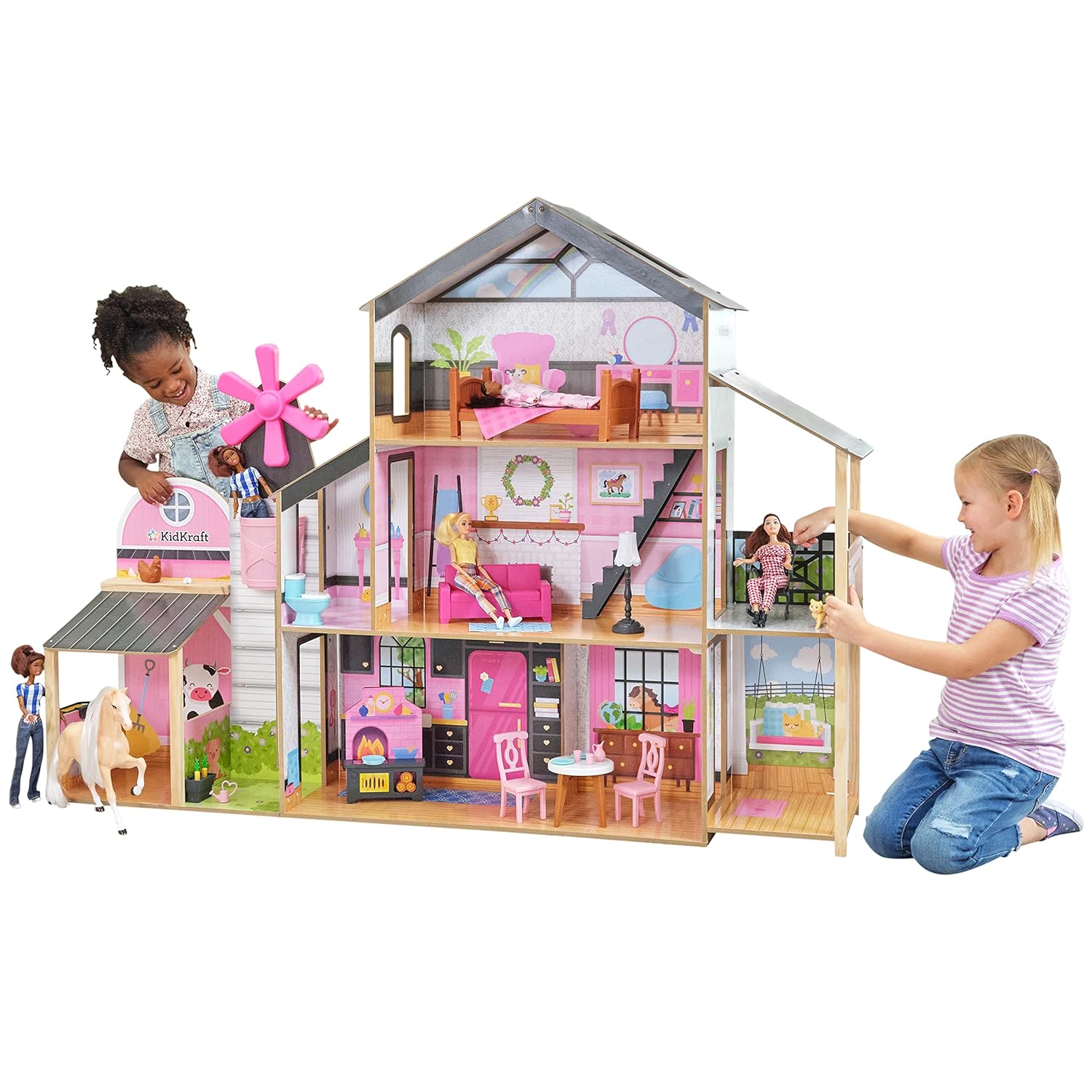 KidKraft Windmill Elevator 2-in-1 Wooden Barn & Dollhouse with Horse and Lights & Sounds, Over 3 Feet Tall