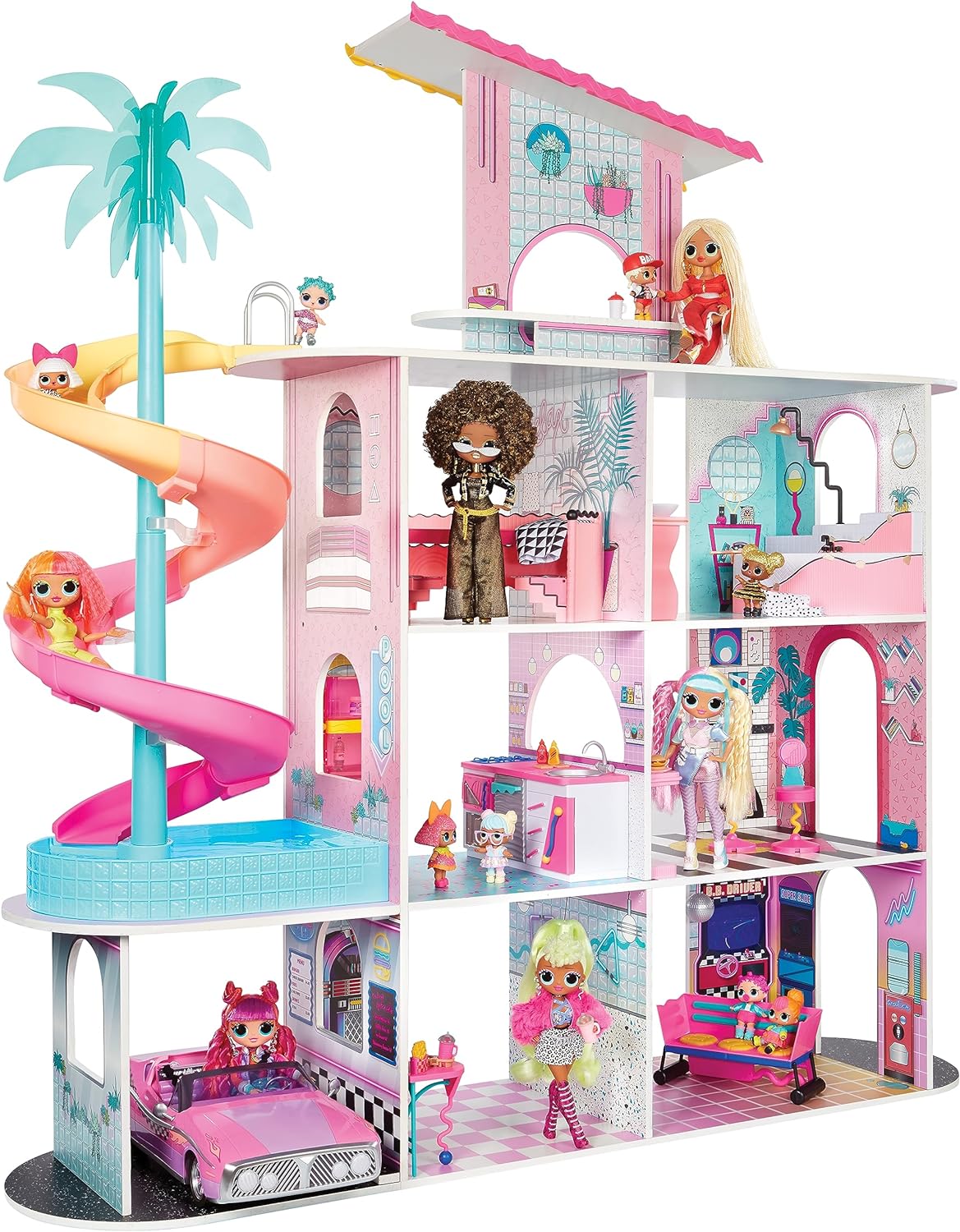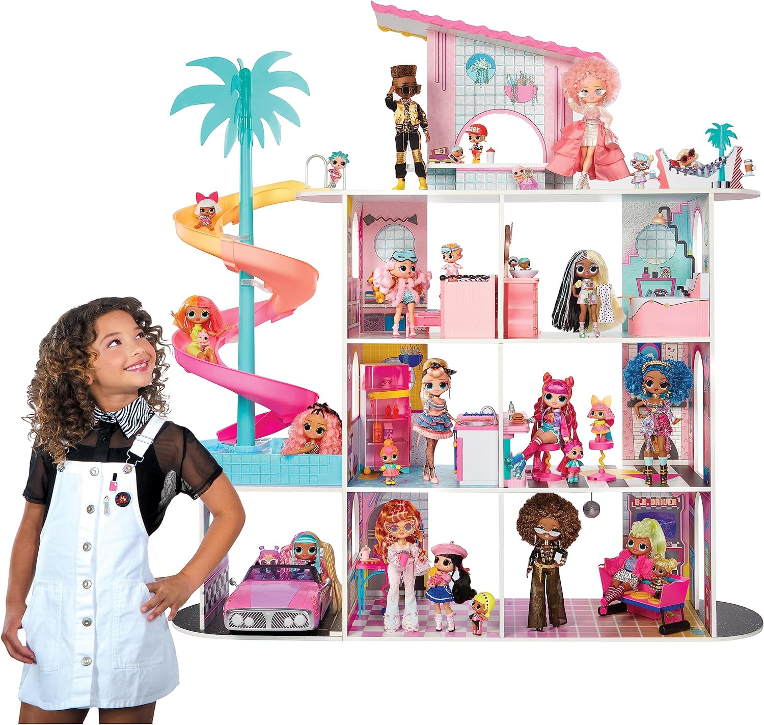 L.O.L. Surprise! OMG Fashion House Playset with 85+ Surprises and Made from Real Wood Including Pool, Spiral Slide, Rooftop Patio, Movie Theater, Transforming Furniture, and More!