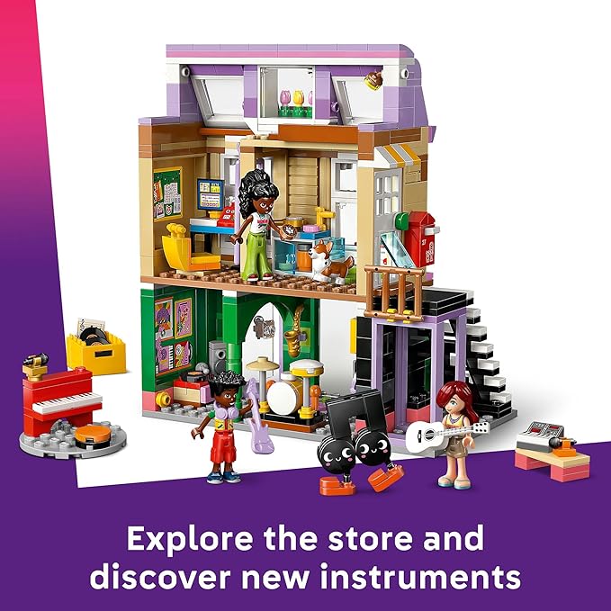 - A building set toy for music-lovers – This LEGO Friends Music Store & Apartment set includes lots of music-inspired accessories, including a toy drum kit, piano, guitar, saxophone and more