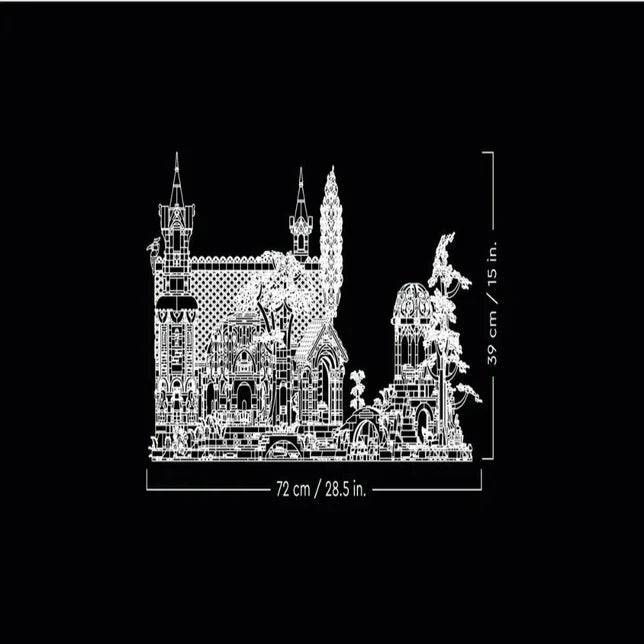 - Dimensions – The set measures over 39 cm (15 in.) high, 72 cm (28.5 in.) wide and 50 cm (19.5 in.) deep and splits into 3 sections: the tower, the council ring and the gazebo with river and bridge
