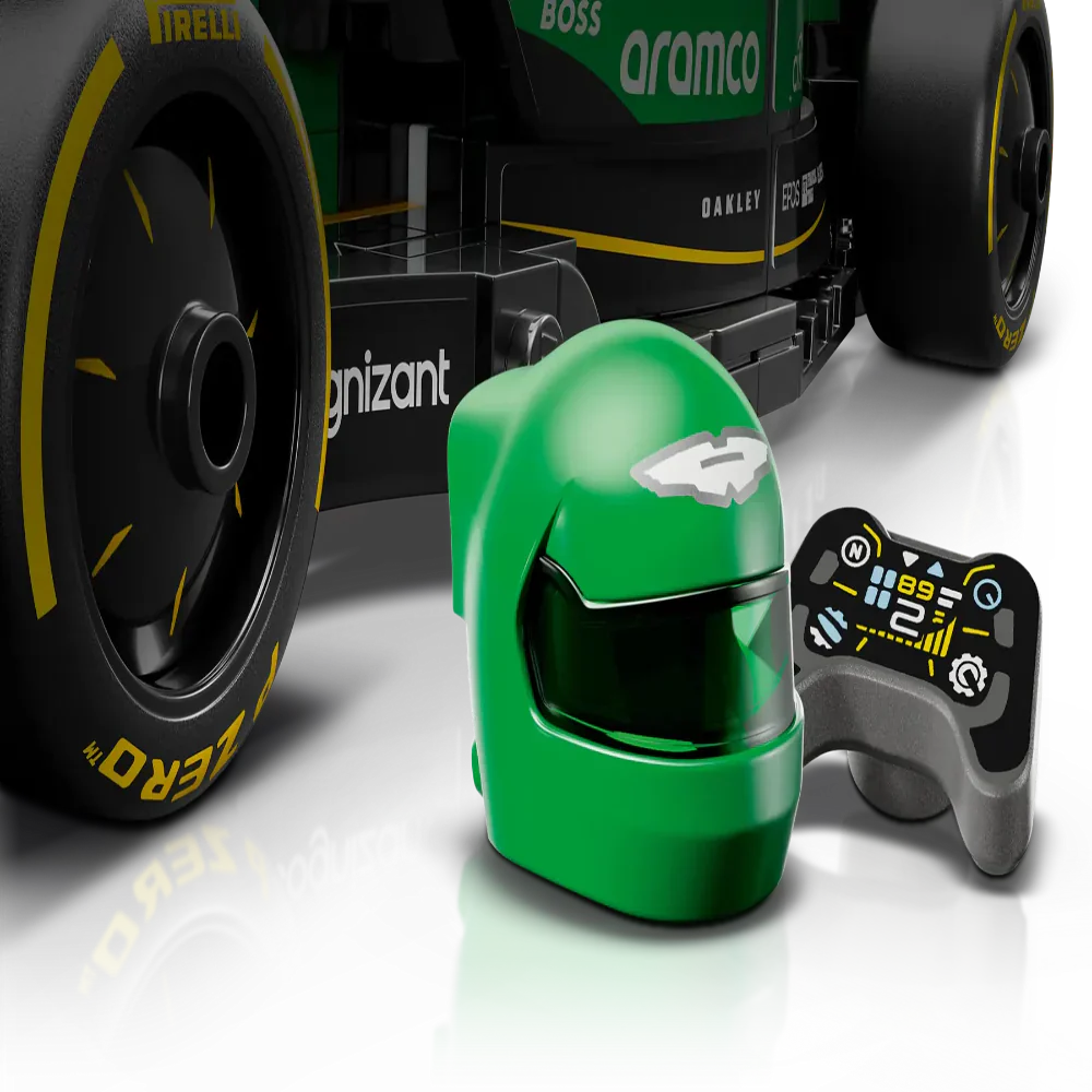 - 1 minifigure – This vehicle set includes a driver minifigure wearing an Aston Martin Aramco F1 outfit and a winged helmet for kids to place inside the cockpit and role-play thrilling race action