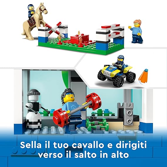 - What’s in the box? – Includes a 2-level police station with lots of outdoor academy training facilities for the LEGO City police officers, plus a toy quad bike, 6 minifigures and a horse figure