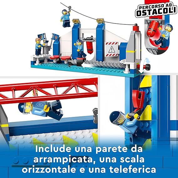 - Fun features and functions – Kids can put the police cadet minifigures through their paces with a toy climbing wall, monkey barsand zip line, plus a fun course with moving obstacles