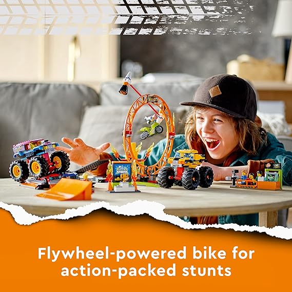 - Kids stage awesome displays and competitions featuring a flywheel-powered stunt bike and 2 car-crushing monster trucks. Combine this set with others from the LEGO City Stuntz range for even more fun!
