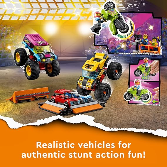 - Set the scene for action-packed play with this LEGO City Stunt Show Arena (60295) toy playset – packed with exciting props and challenges for cool competitions and crowd-thrilling performances.