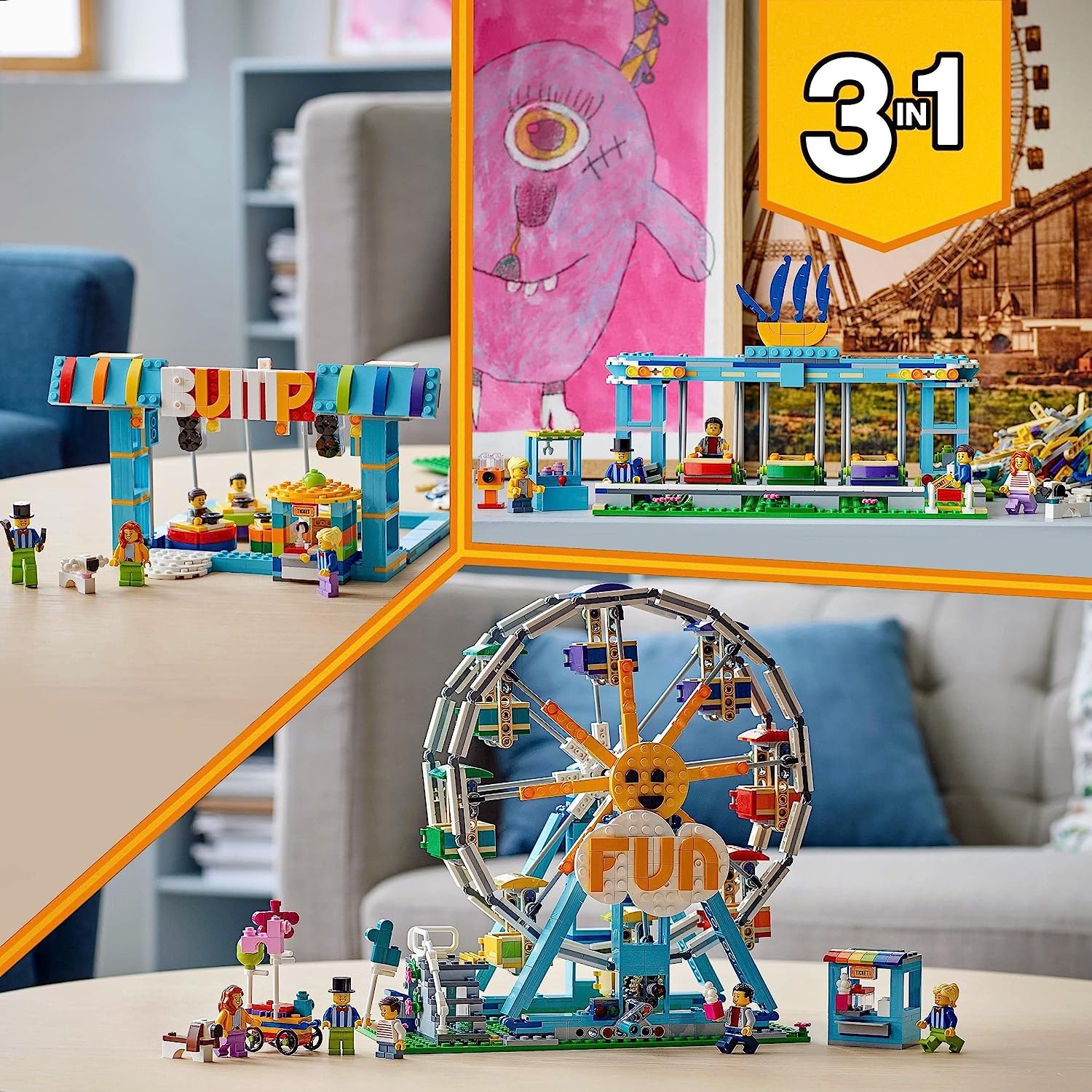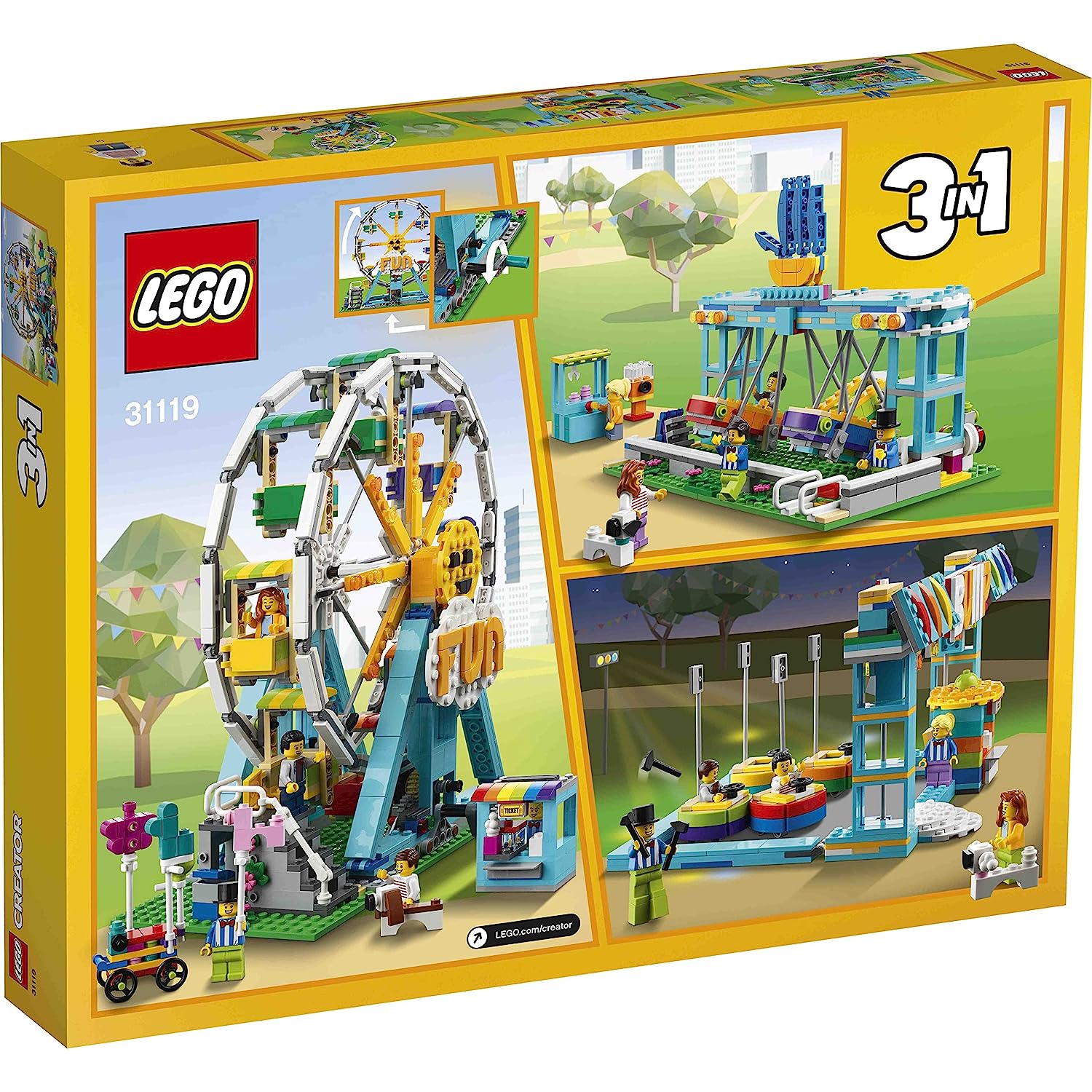 - The LEGO Creator 3in1 Ferris Wheel (31119) amusement park toy set jump-starts kids’ creativity with 3 models in 1 – a Ferris Wheel, bumper car ride and swing boat ride.