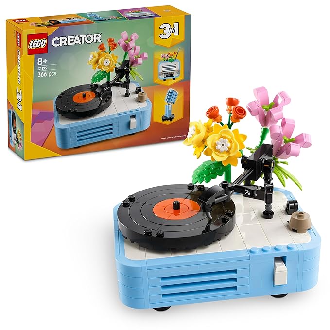 - 3 LEGO music set building options in 1 box – The LEGO Creator 3in1 Record Player with Flowers toy playset lets kids aged 8 and up build and rebuild 3 different retro-style models with the same bricks