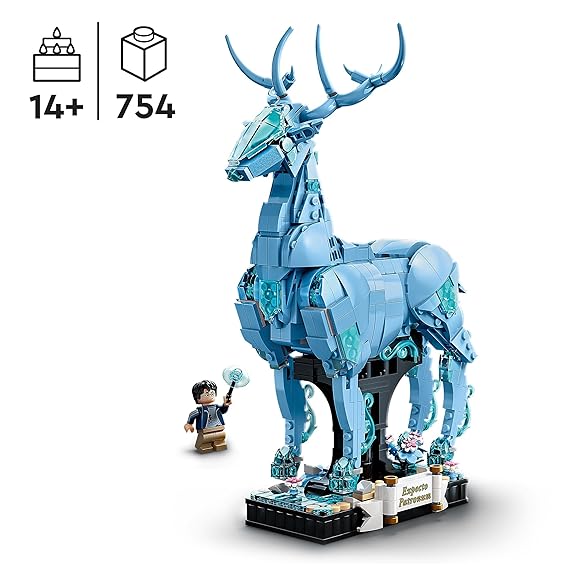 - Stag Patronus – Features posable legs, translucent light-blue elements for a ghostly look and an integrated display stand that has decorative elements and space forthe Harry Potter minifigure