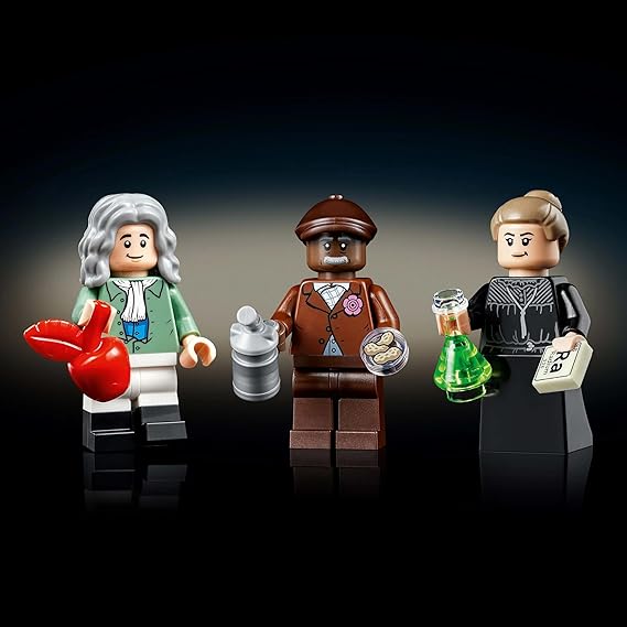 - 3 LEGO minifigures – The “mother of modern physics” Marie Curie (née Skłodowska), Sir Isaac Newton, leader of the Scientific Revolution, and agricultural science pioneer George Washington Carver