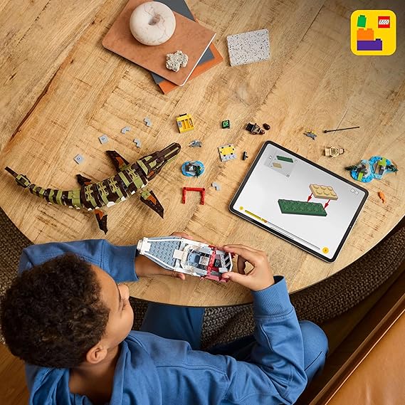 - Mosasaurus toy dinosaur set – Thrill Jurassic World Rebirth movie fans aged 9 and up with this Brick-Built Mosasaurus Boat Mission building kit, combining dinosaurs and action play