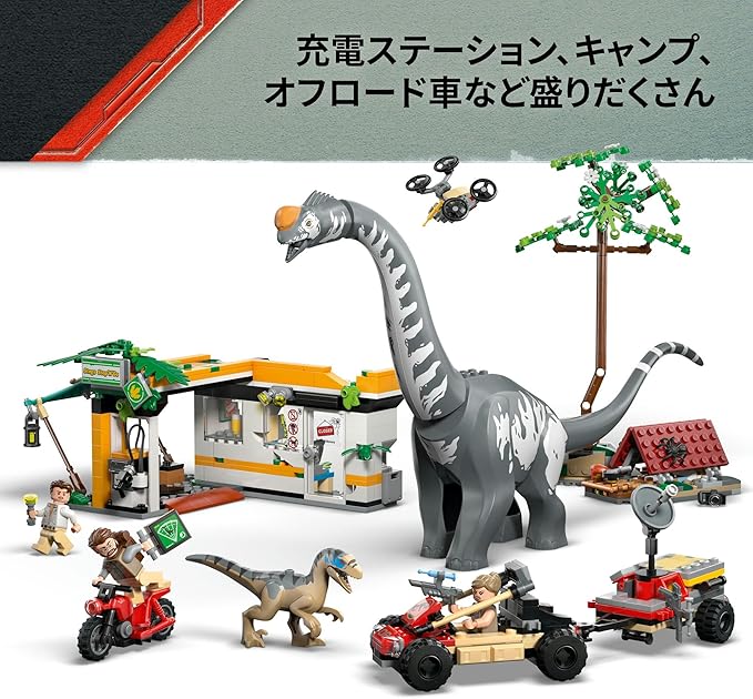 - CREATIVE GETTING - Includes a tipping tree, a drone that can be attached to a car or charging stand, a velociraptor with opening mouth, and a Titanosaurus with movable head, neck and tail