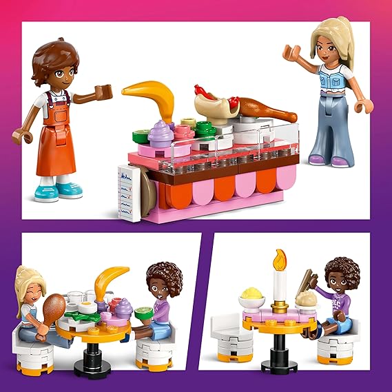 - A building kit with lots of accessories – Restaurant-themed elements include menu cards, an oven, a notepad, cheese grater, blender, mixer, piping bag, saltshaker, pepper shaker, a broom and more