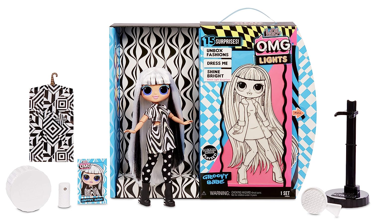 - Unbox 15 surprises with L. O. L. Surprise O. M. G. Lights fashion doll, Groovy Babe, with stunning features, styled hair and articulated for tons of poses