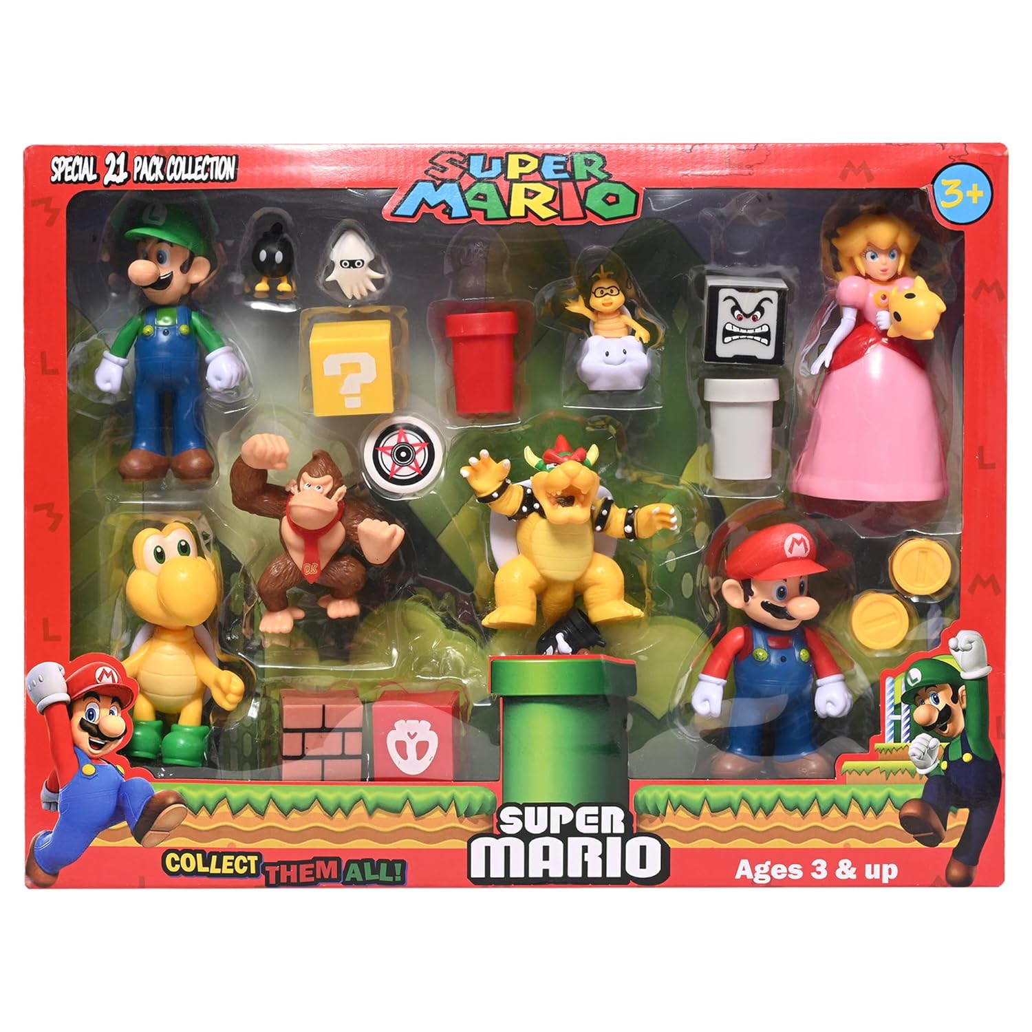- The set contains 21 figures and characters with the Mario brothers as the core of the characters and is very well loved