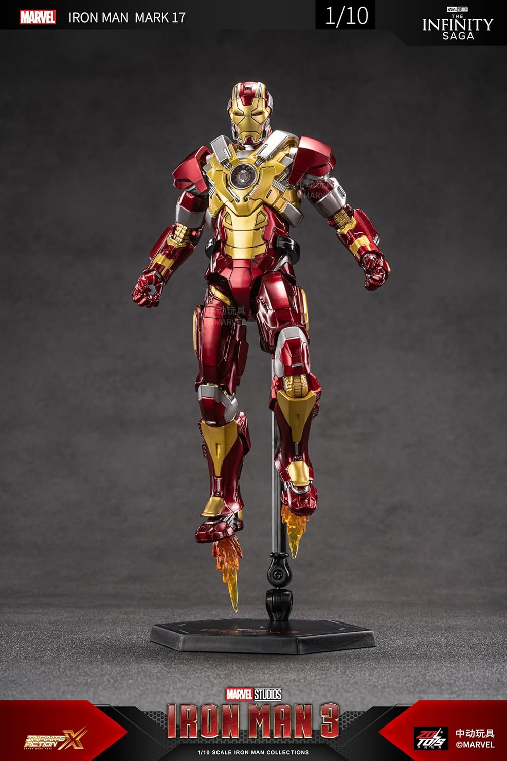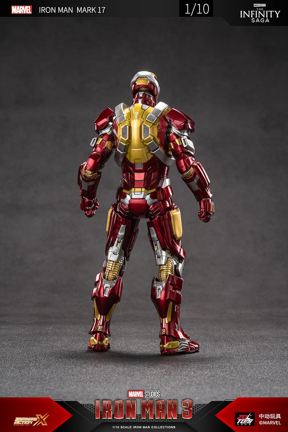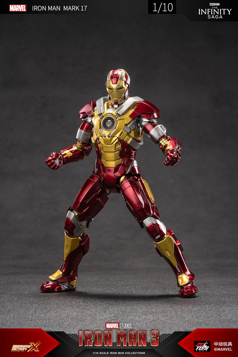 Bring home the power of Tony Stark's Heartbreaker armor with this highly detailed Iron Man Mark 17 collectible action figure from Iron Man 3 – part of the official Marvel Infinity Saga. Designed in 1/10 scale, this action figure showcases metallic red, gold, and silver detailing, true to the movie version.