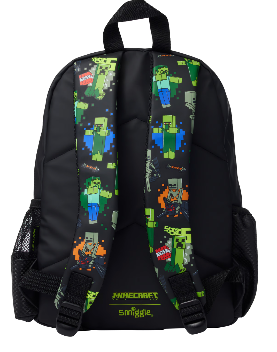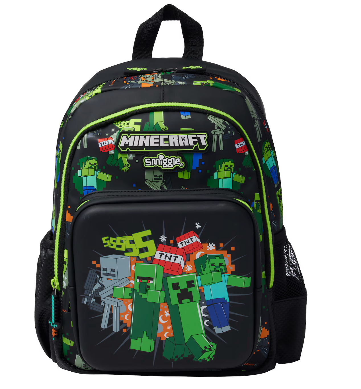 Pack for preschool adventures with our Minecraft Junior Character Backpack! It features a protective hardtop front pocket with everyone's favourite mobs on display. Feel ready to take on the day with dual drink bottle sleeves and three zipped compartments, perfect for stashing diamond mining equipment! Plus, check out the awesome character print filled with iconic elements from the game and sword zip pulls!