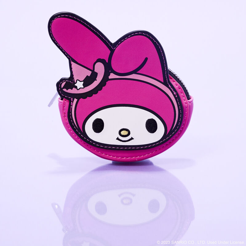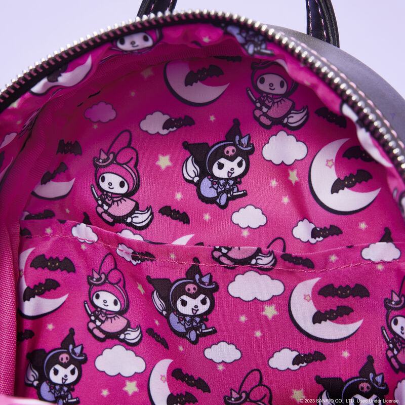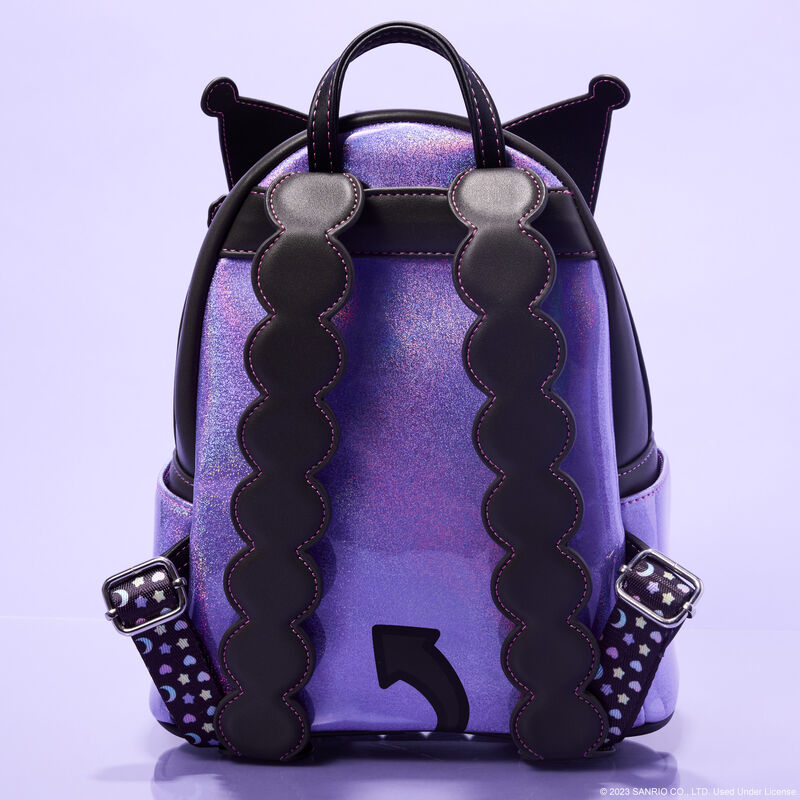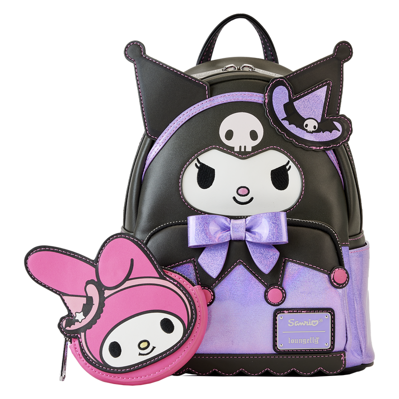 Fly through the night with devilish delight. Scare up some fun with our exclusive Loungefly Kuromi Witch Mini Backpack with Detachable Coin Bag. Kuromi comes to life in applique detail, rising up over the top of the backpack—and she’s dressed as a witch. On the front pocket, the bow of her jester costume is an iridescent purple applique. In fact, the bottom half and reverse side of this bag shimmer in iridescent details. The shoulder straps are a whimsical die-cut scalloped shape, and Kuromi’s devil tail appears on the back. An enamel zipper charm of a pink skull tops off the look, while a detachable coin bag of My Melody adds another pop of pink. Make a scary sweet entrance wherever you go with this bewitching accessory. Act fast to secure this exclusive; supplies are limited.