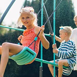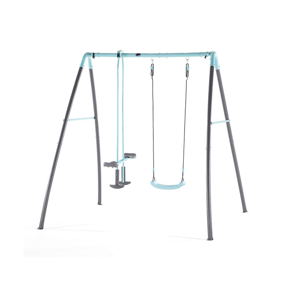 - The Plum Premium Metal single Swing and Glider with Mist comes with adjustable soft-feel ropes for comfort, ergonomic sky blue plastic swing seats and a two-seater glider.