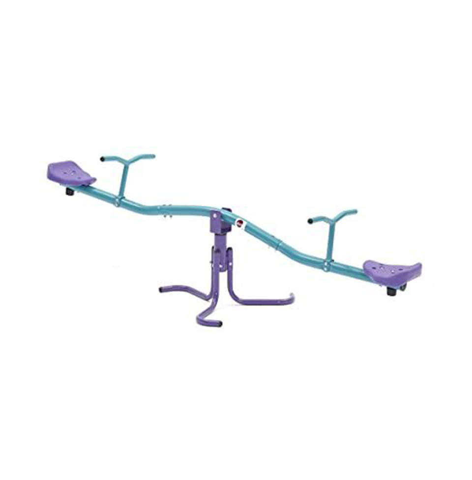 - The metal see saw has comfortable plastic seats and handlebars for stability.