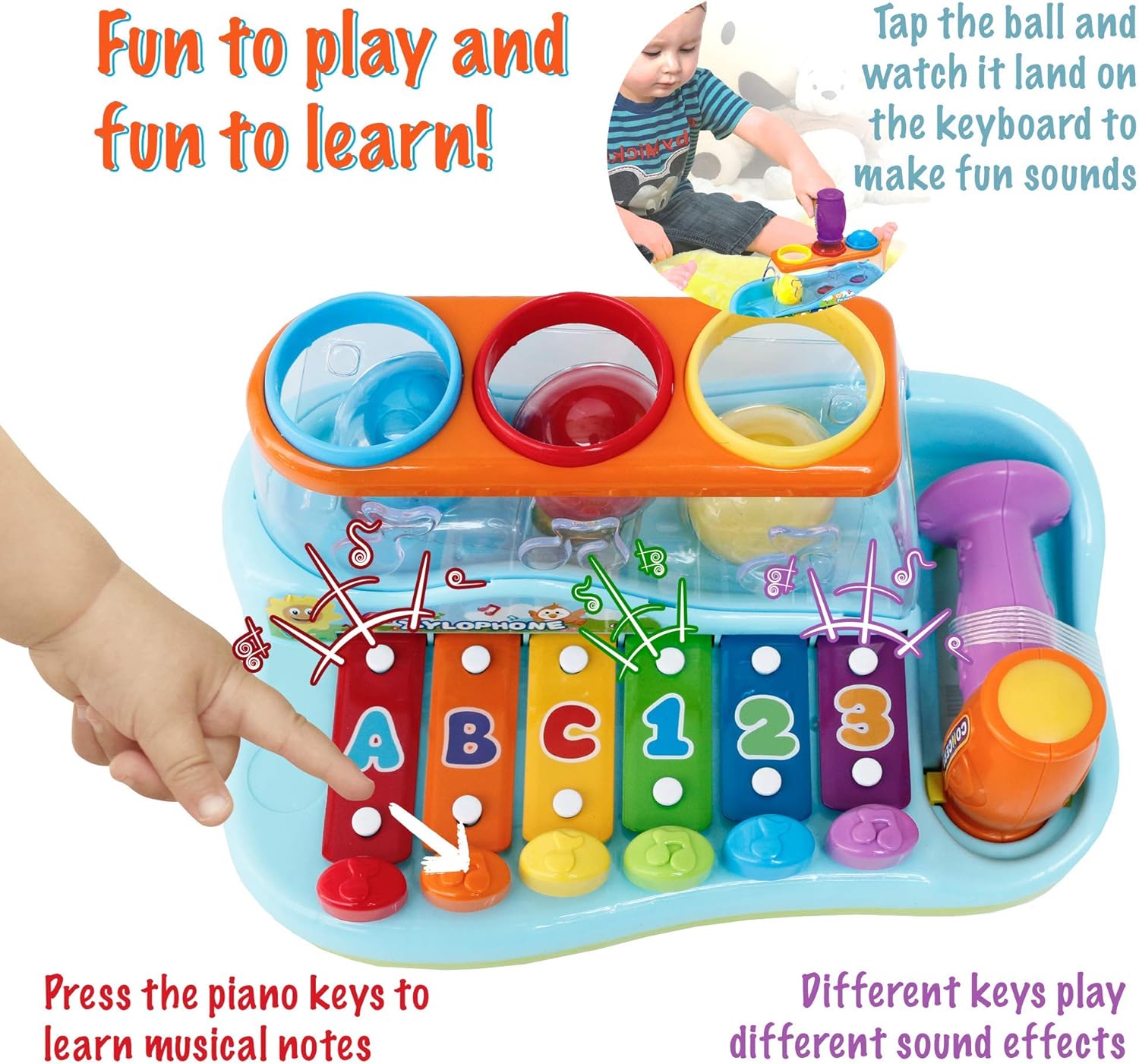 - FUN TO PLAY AND LEARN – Press piano keys or use the xylophone toy instruments hammer to learn musical notes; keys numbered 1-3 and A-B-C teach beginning counting and alphabet skills; high quality baby pounding toy